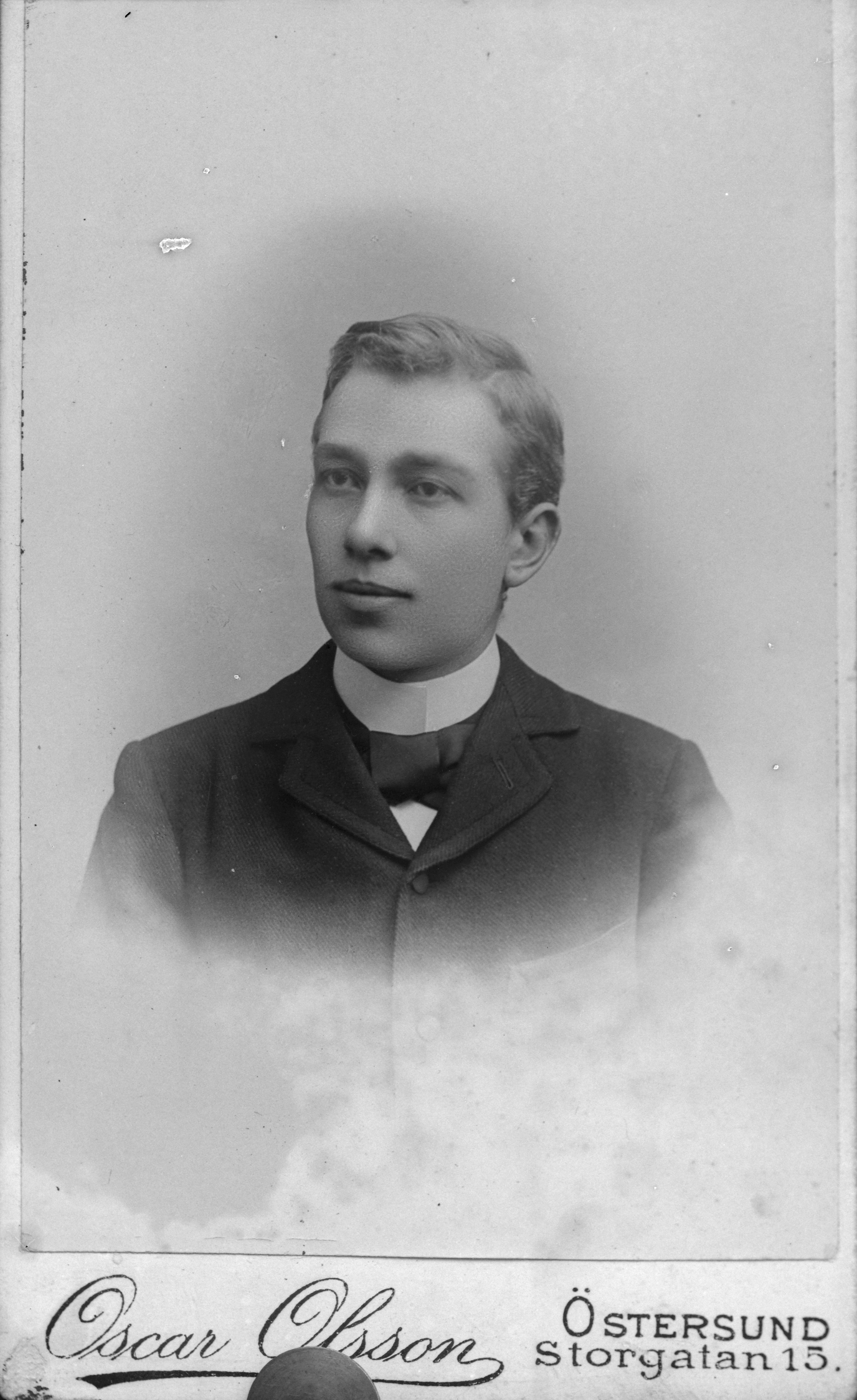 Porträtt i halvfigur av oidentifierad man. Visitkort med ateljélogotyp, "Oscar Olsson /Östersund /Storgatan 15".