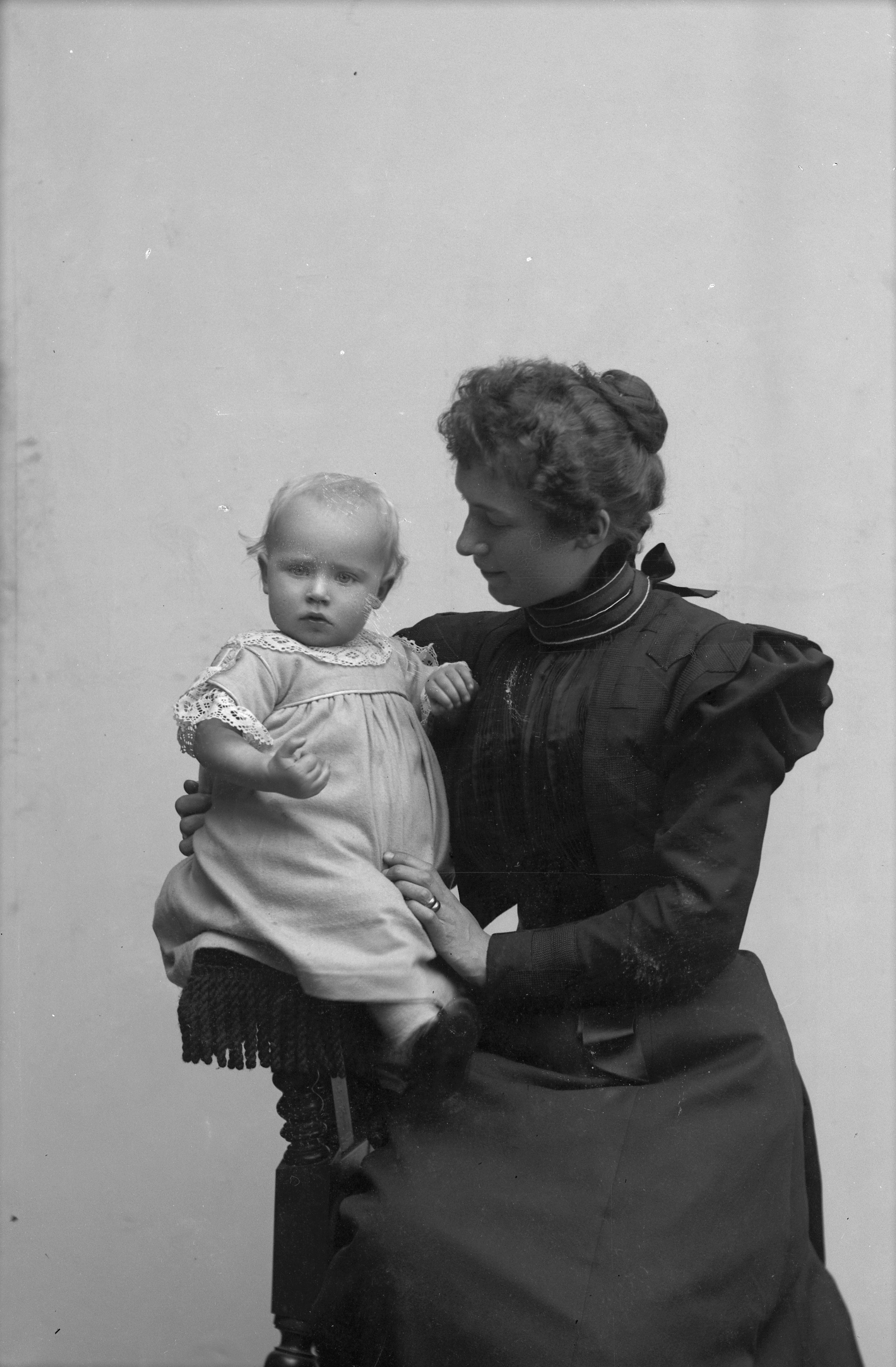 Porträtt i helfigur av fru Stave, hållande sitt barn i famnen.