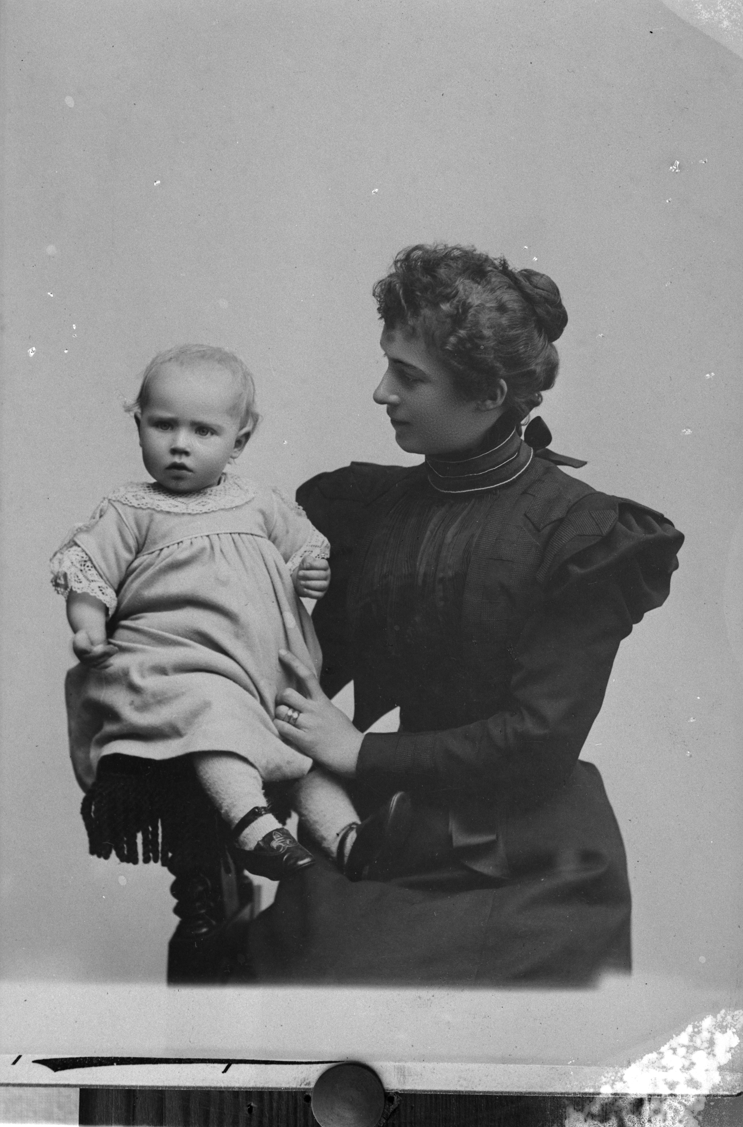 Porträtt i halvfigur av fru Stave, hållande sitt barn i famnen. Barnet i helfigur.