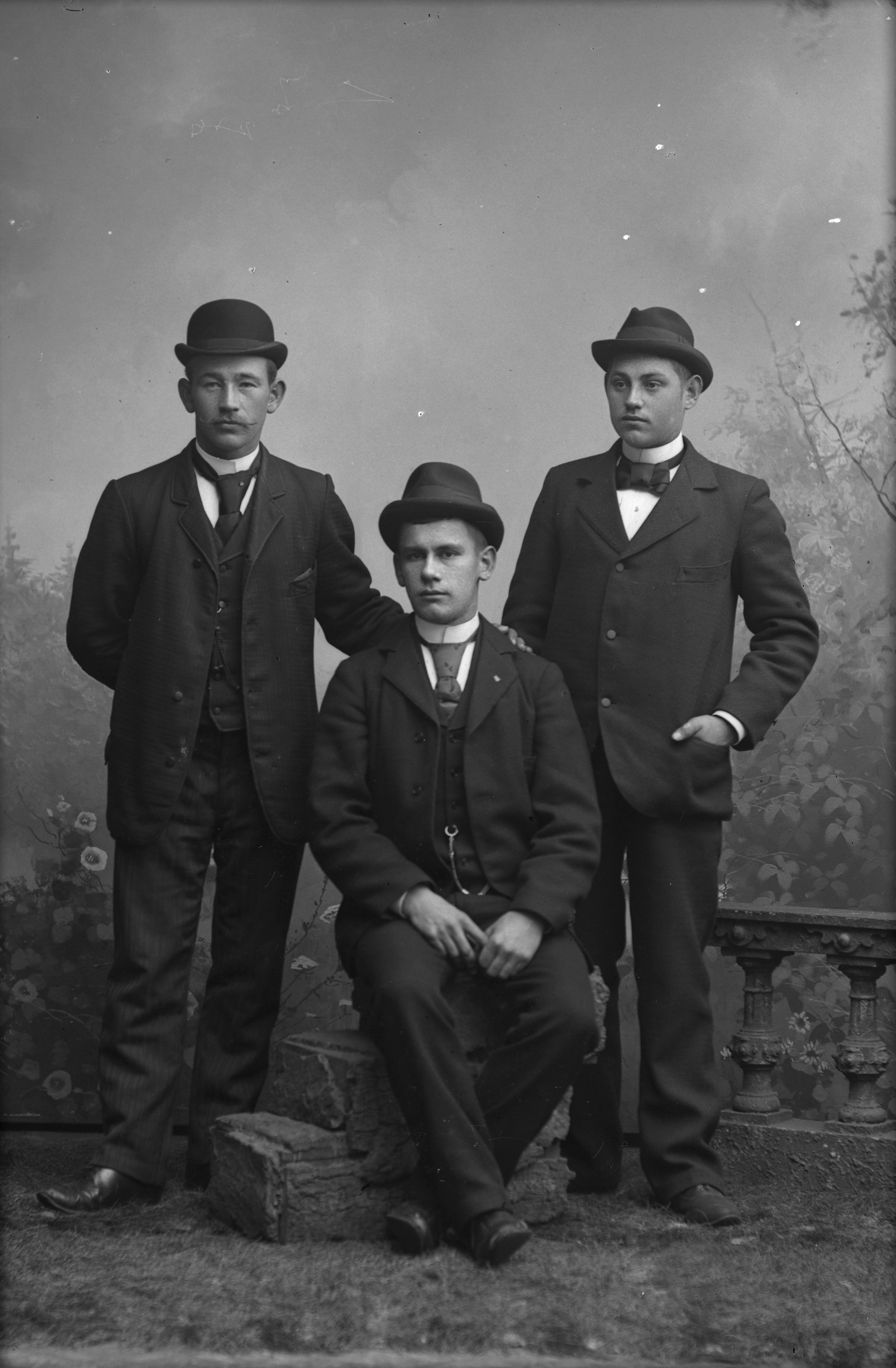Porträtt i helfigur av herr Homstrand med okänt sällskap. två andra män, sittande och stående. Alla iklädda hattar, mannen till vänster i plommonstop.