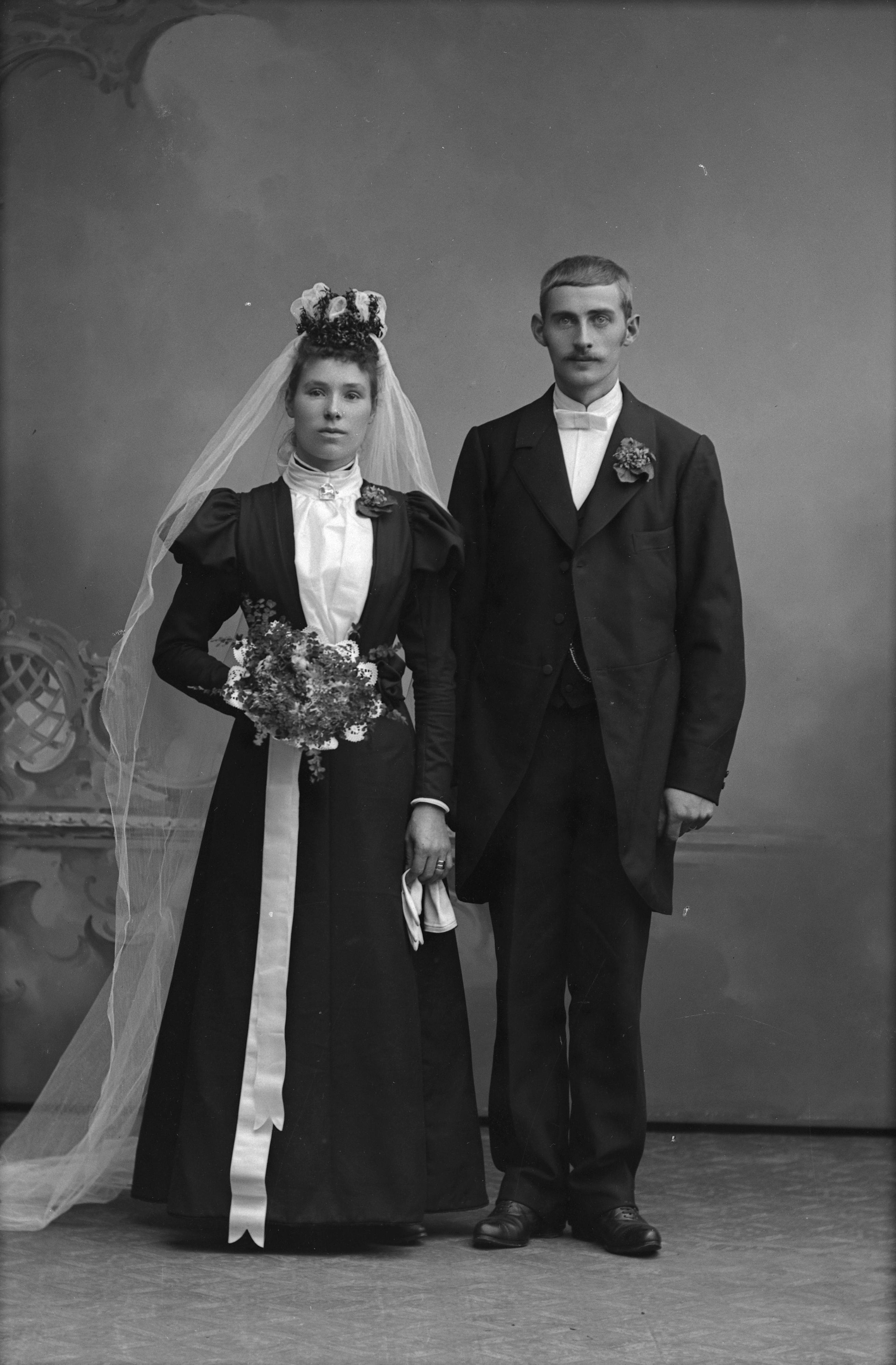 Porträtt i helfigur av A. Andersson med brud.