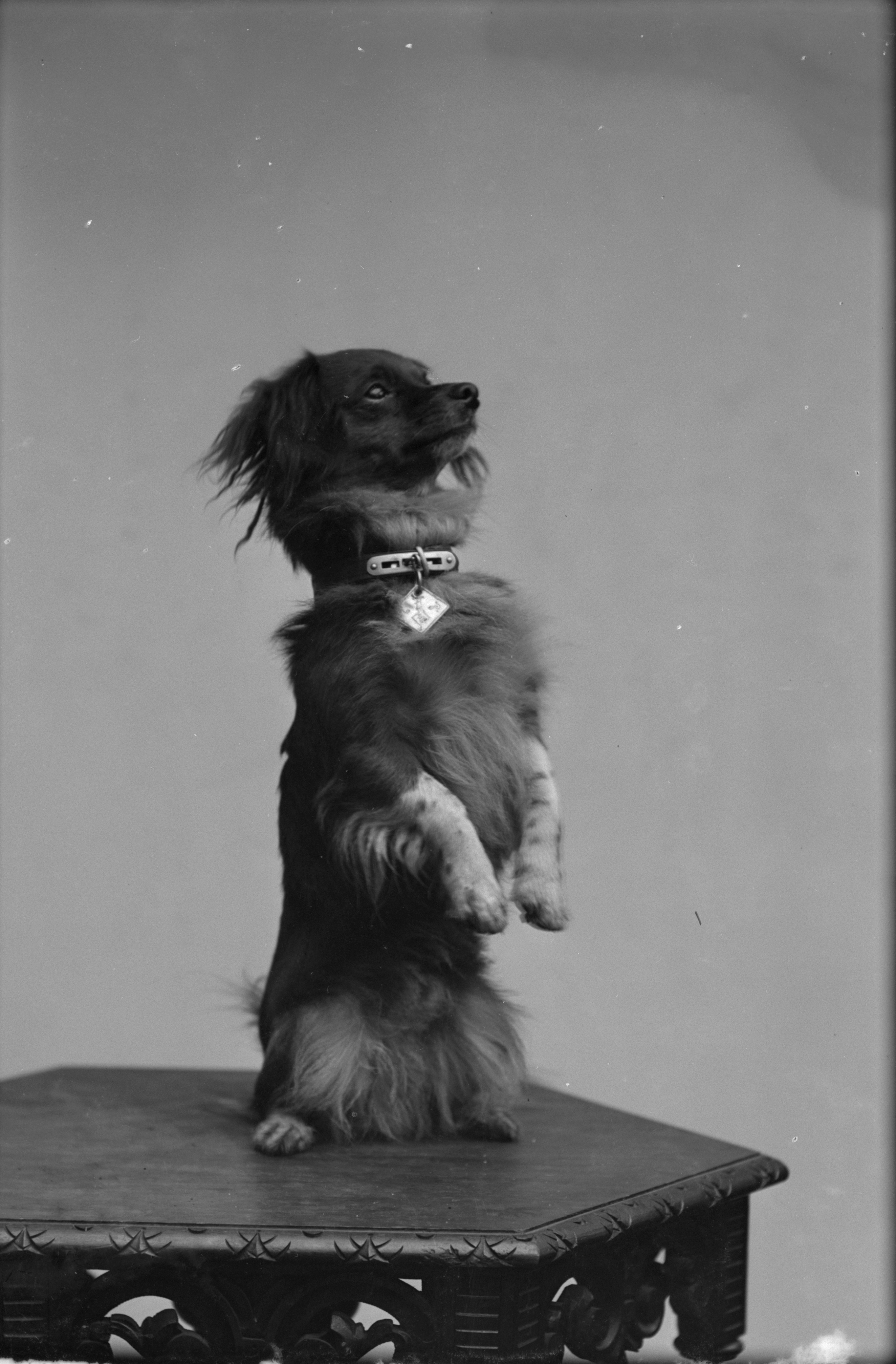 Porträtt av fröken Correus hund, sittande på bakbenen på bord.