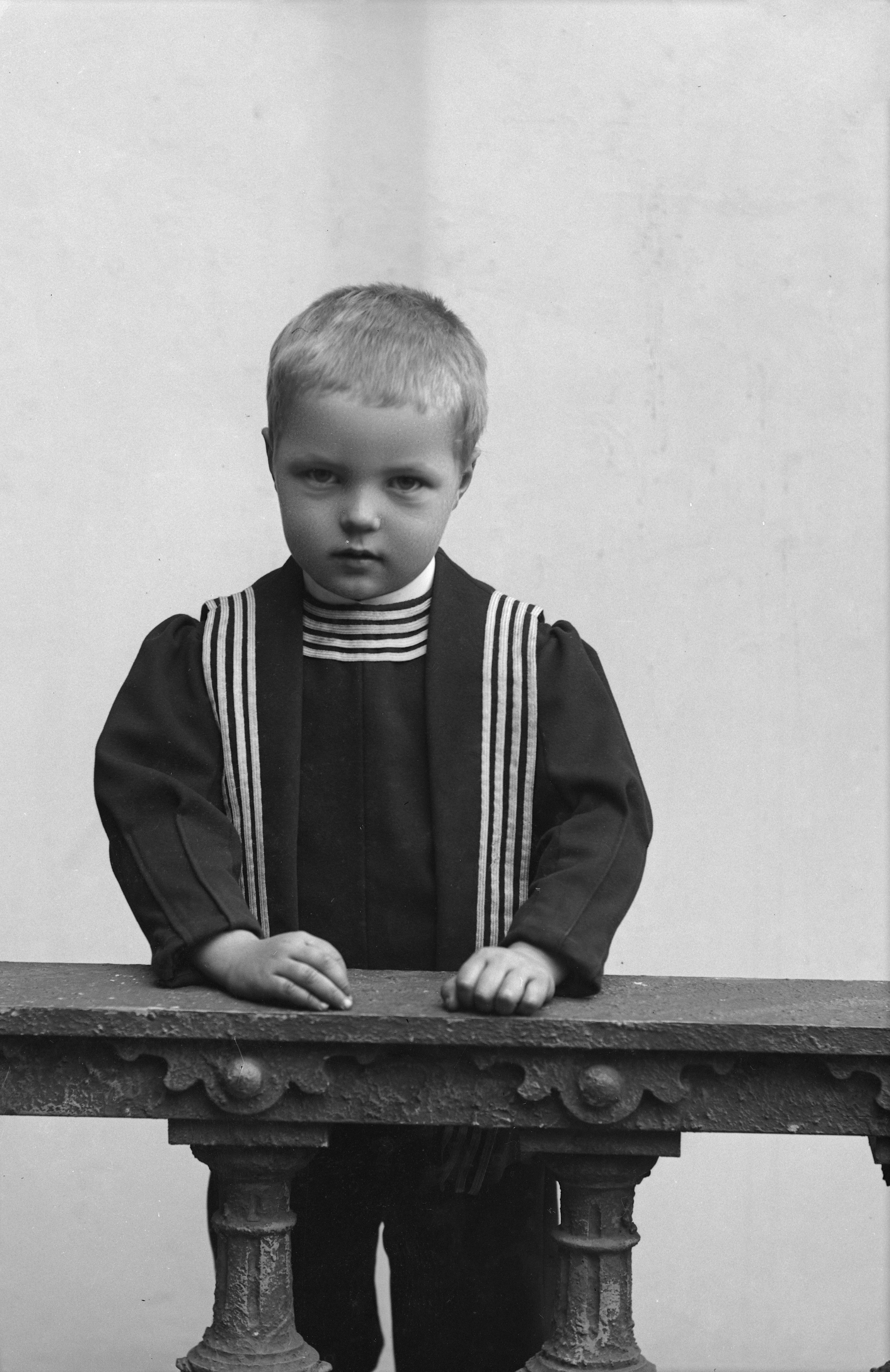 Porträtt i helfigur av Blomquists son, stående bakom stenstaket.