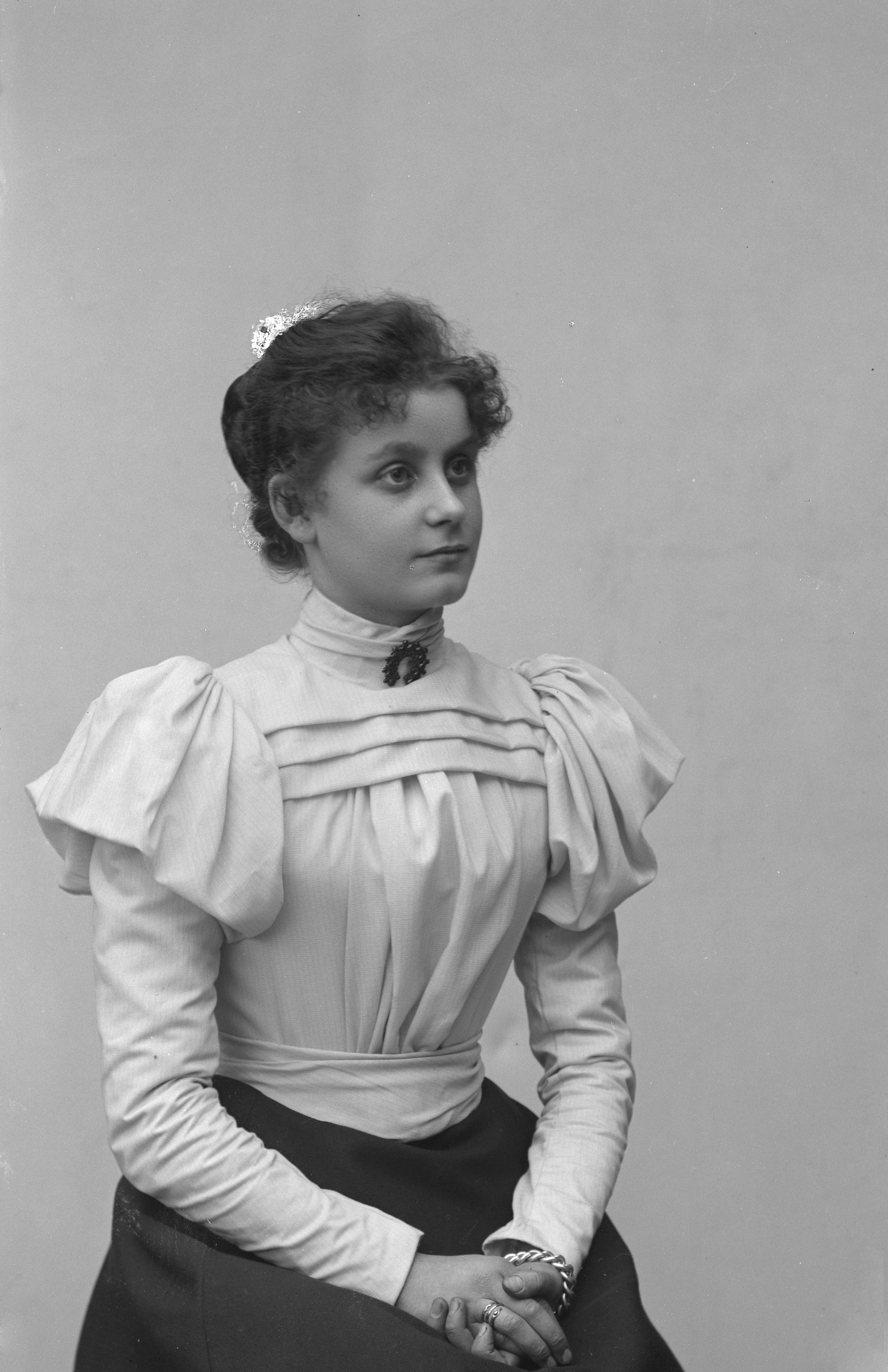 Beskrivning: Porträtt i halvfigur av Mia Person bärande brosh och blus med puffärmar.
