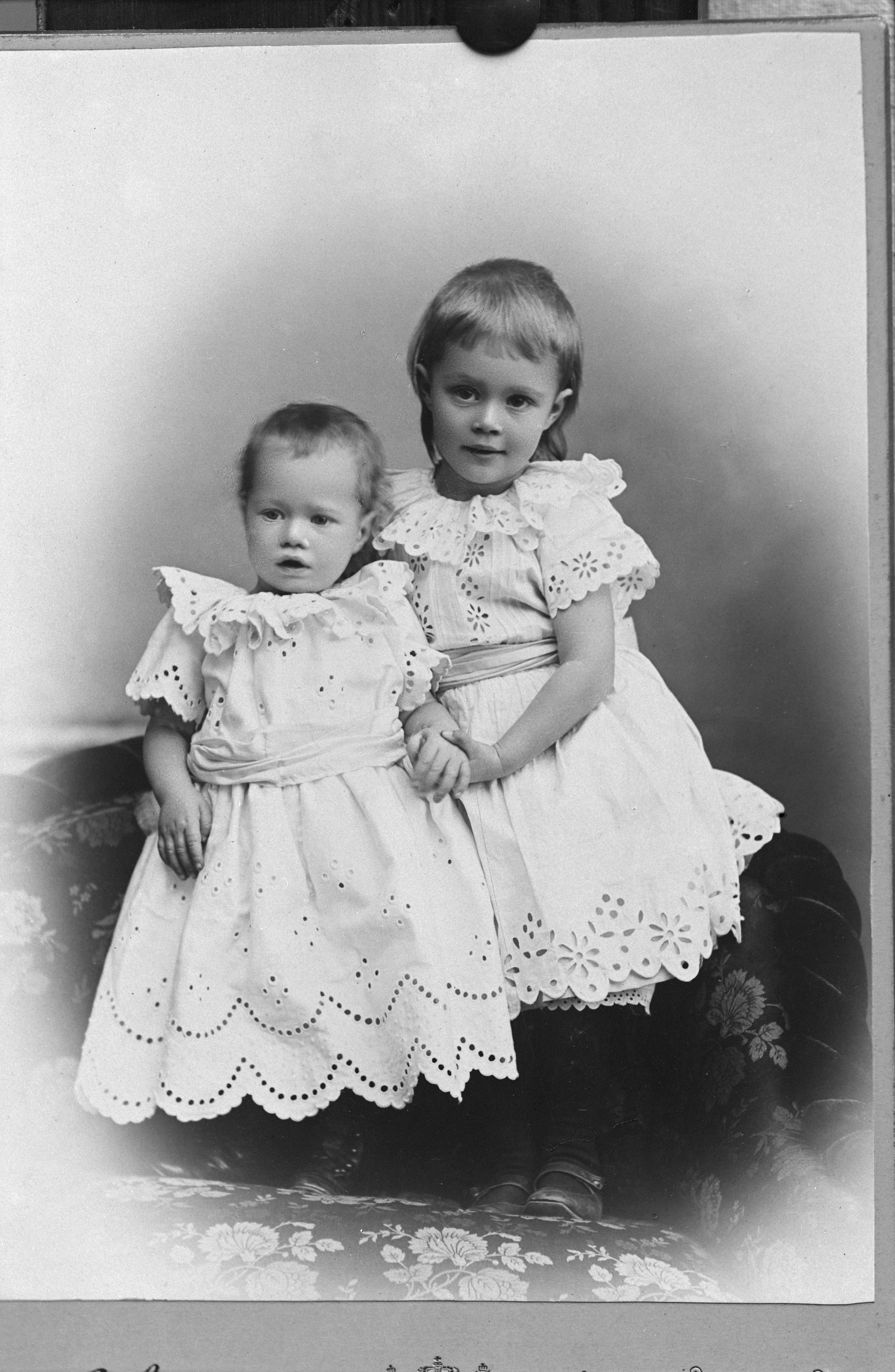 Porträtt i helfigur av Edstrands döttrar, stående vid soffa, hållande hand.