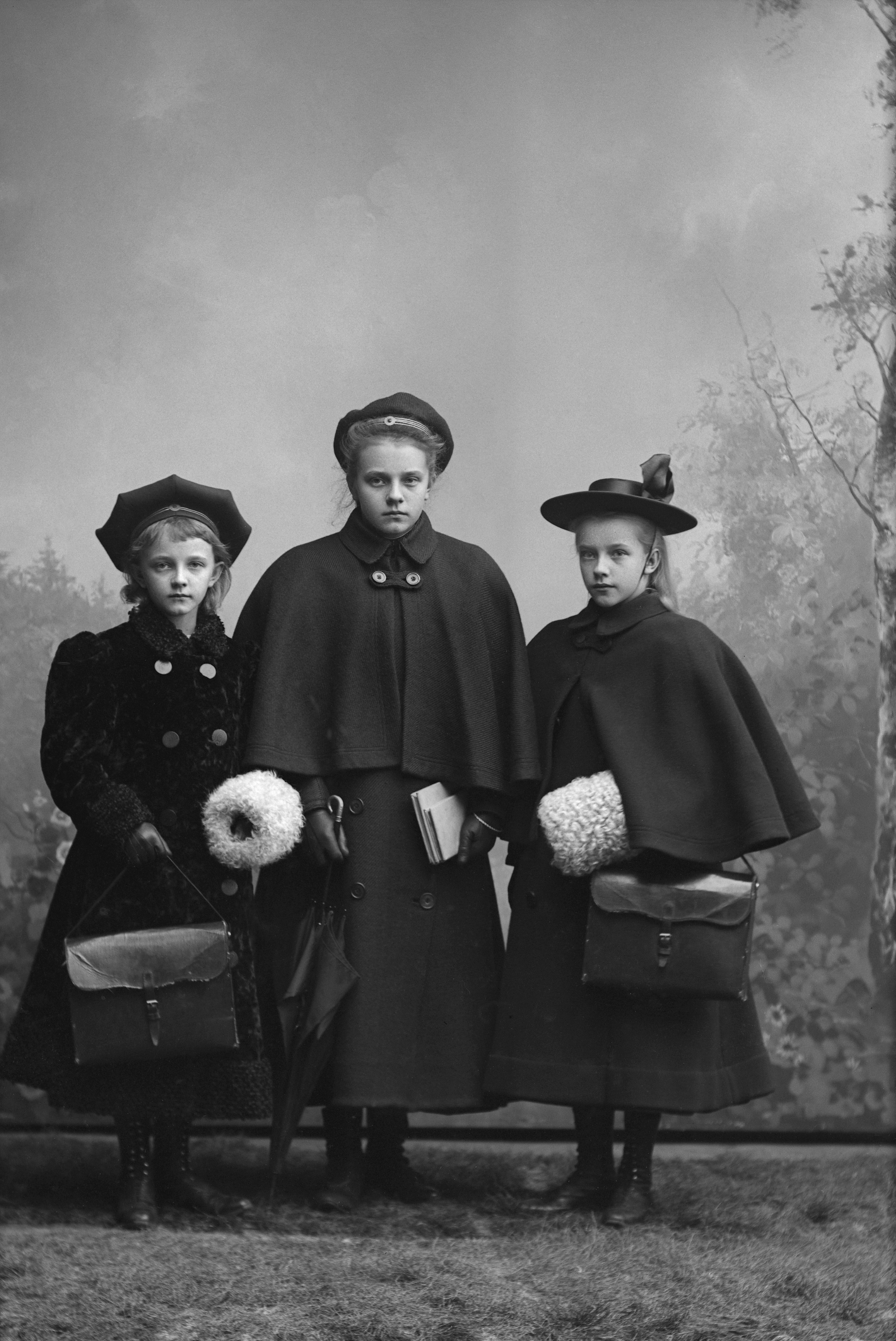 Porträtt i helfigur av Greta Dufberg med två okända flickor, sannolikt systrarna Annie och Elly, iklädda hattar och ytterkläder. Flickorna med handmuffar, hållande handväskor. Greta Dufberg i mitten, hållande paraply. Fotograferade framför ateljéfond med skogsmotiv.