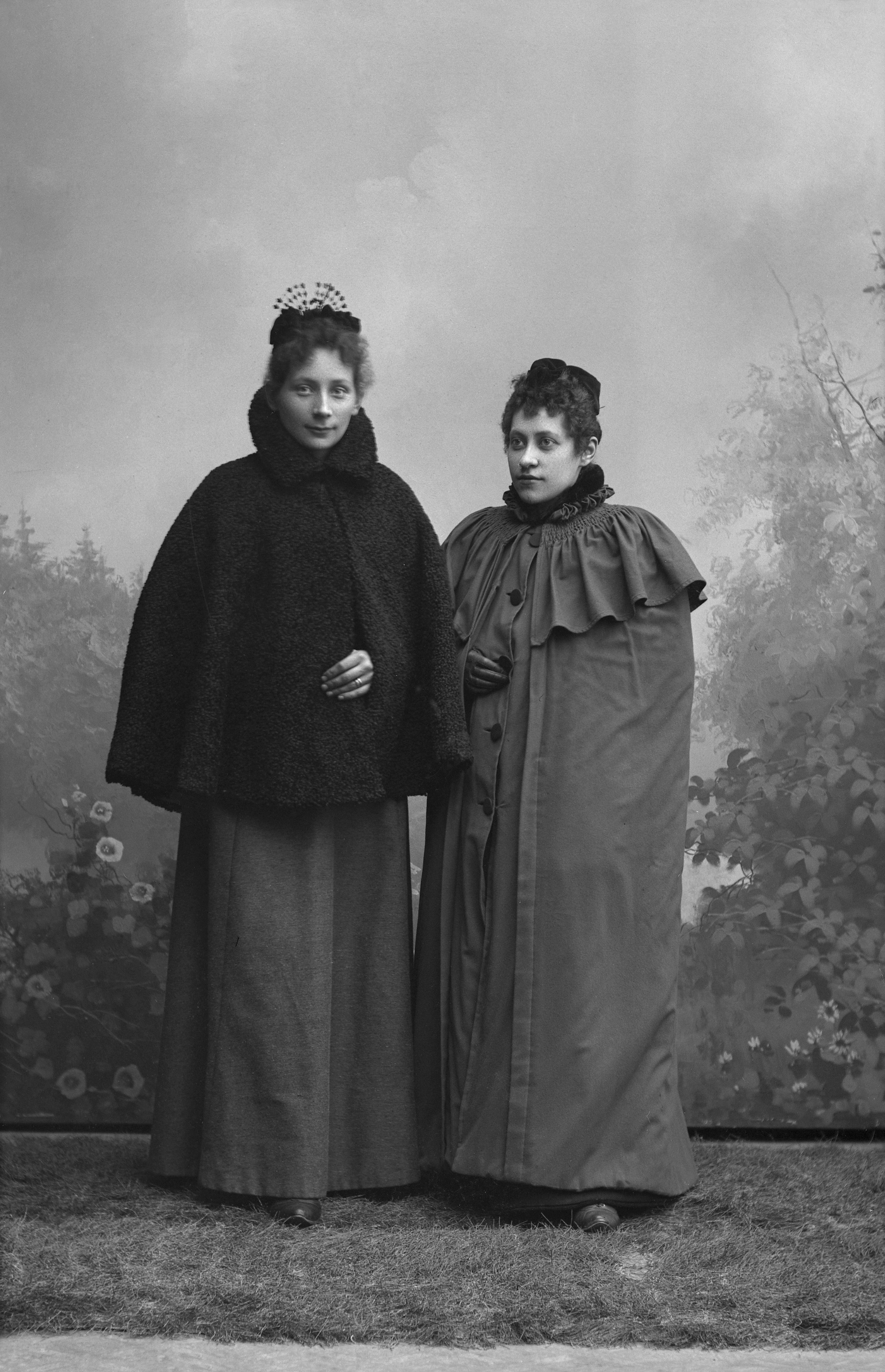 Porträtt i helfigur av fru Borman med okänd kvinna, iklädda mössor och ytterkläder. Fotograferade framför ateljéfond med skogsmotiv.