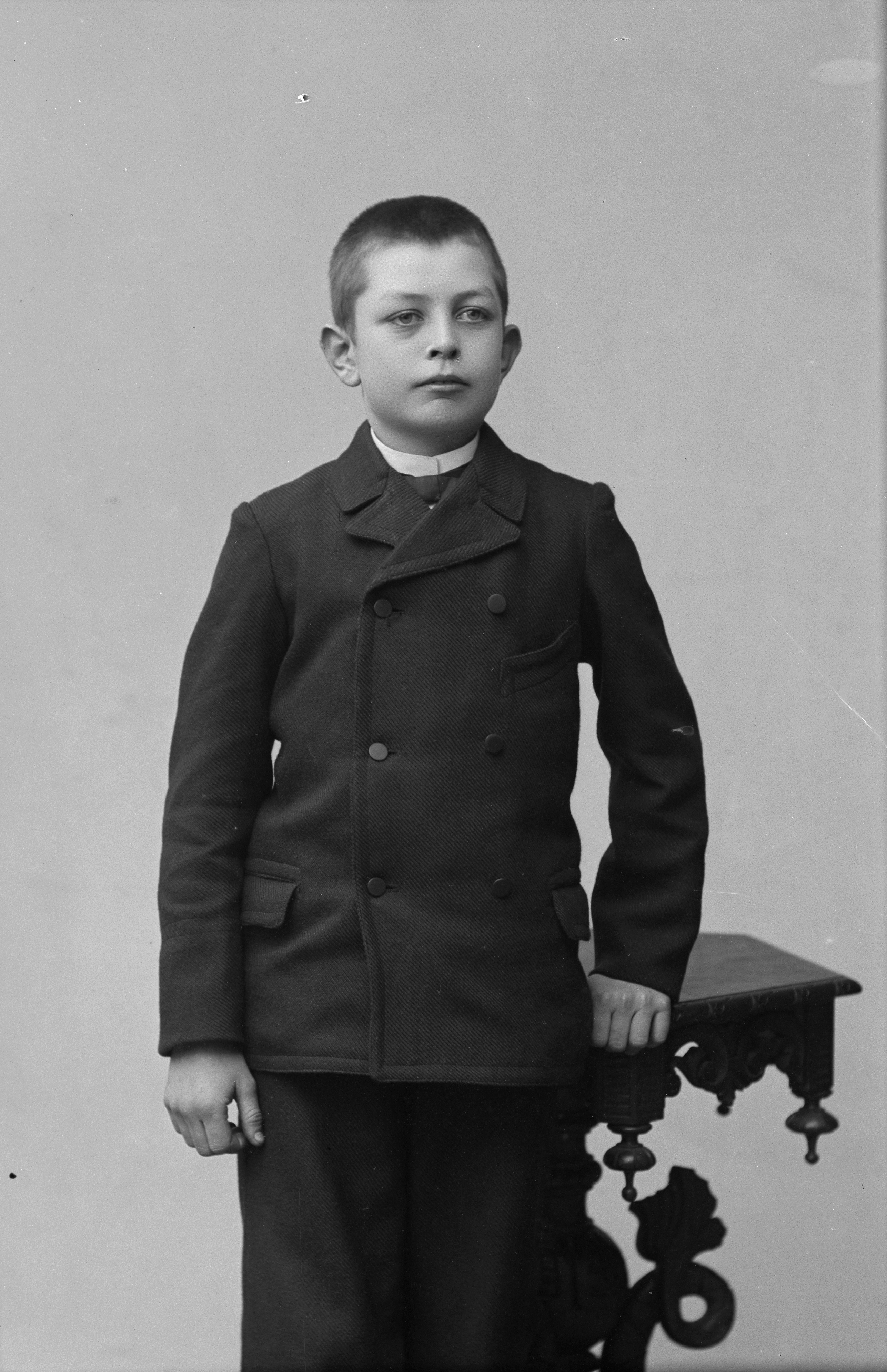 Porträtt i helfigur av Anders Olsson, stående vid bord.