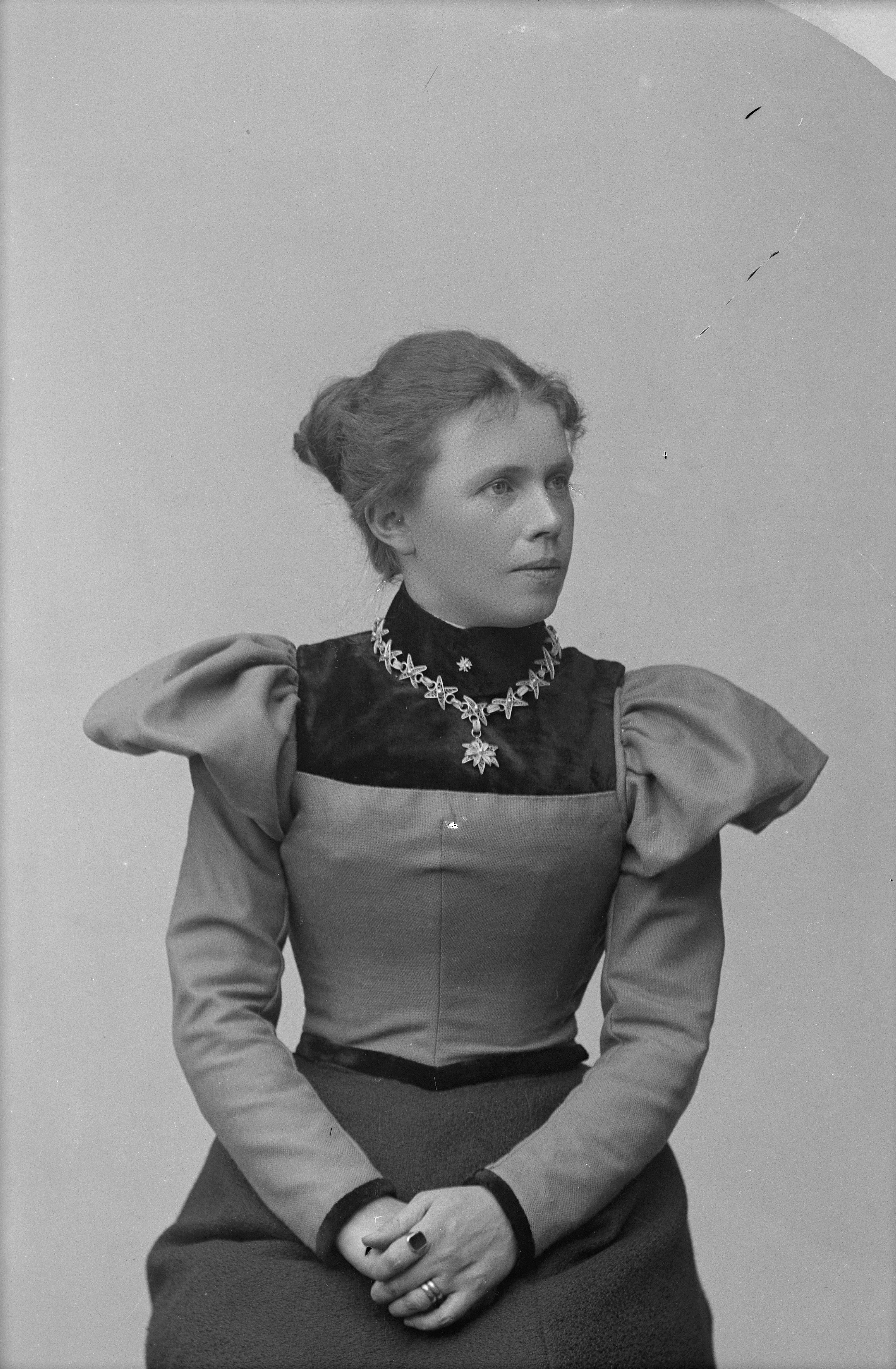 Beskrivning: Porträtt i halvfigur av Torborg Stenström.