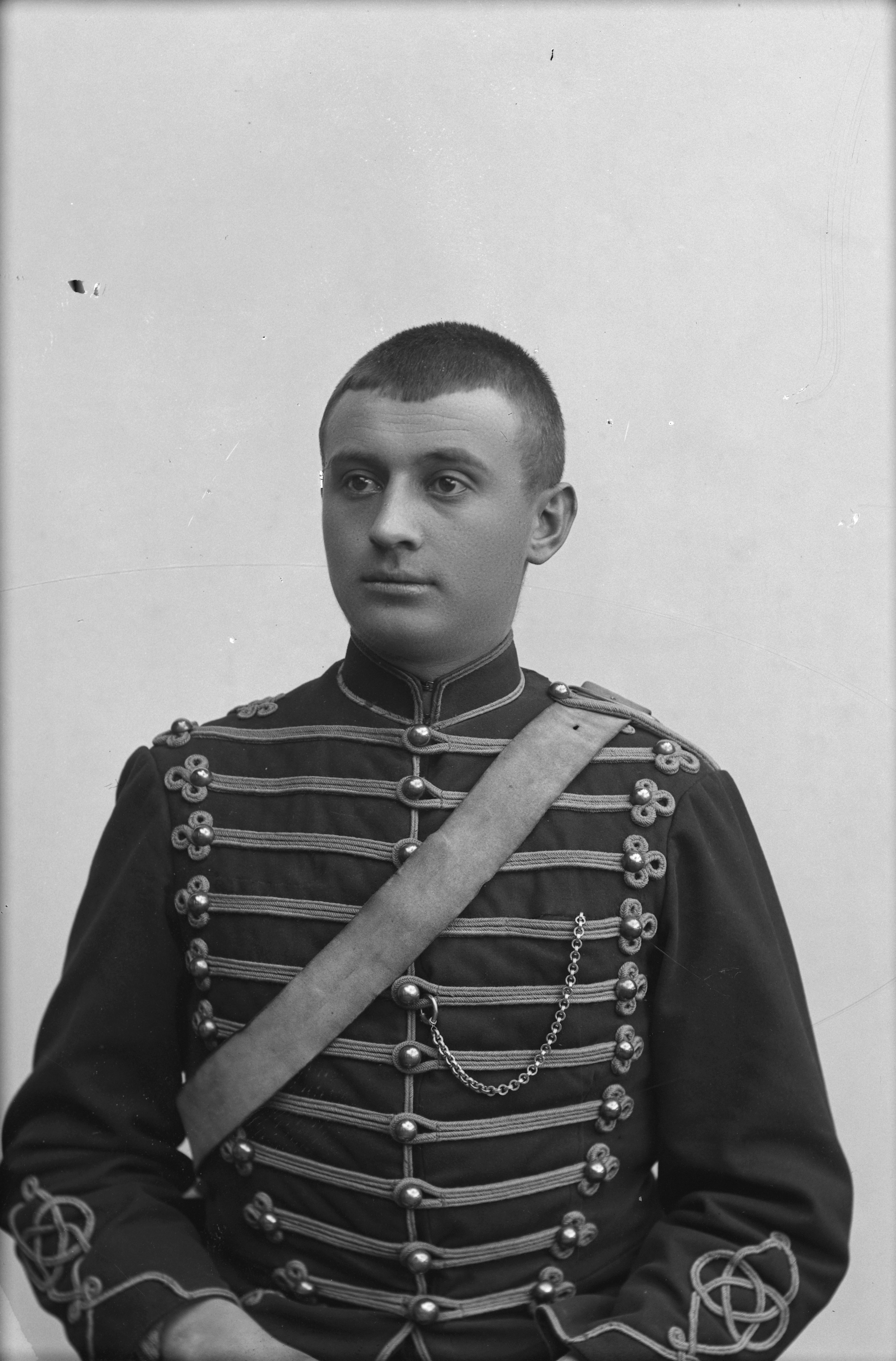 Porträtt i halvfigur av husar Engström, iklädd militäruniform.