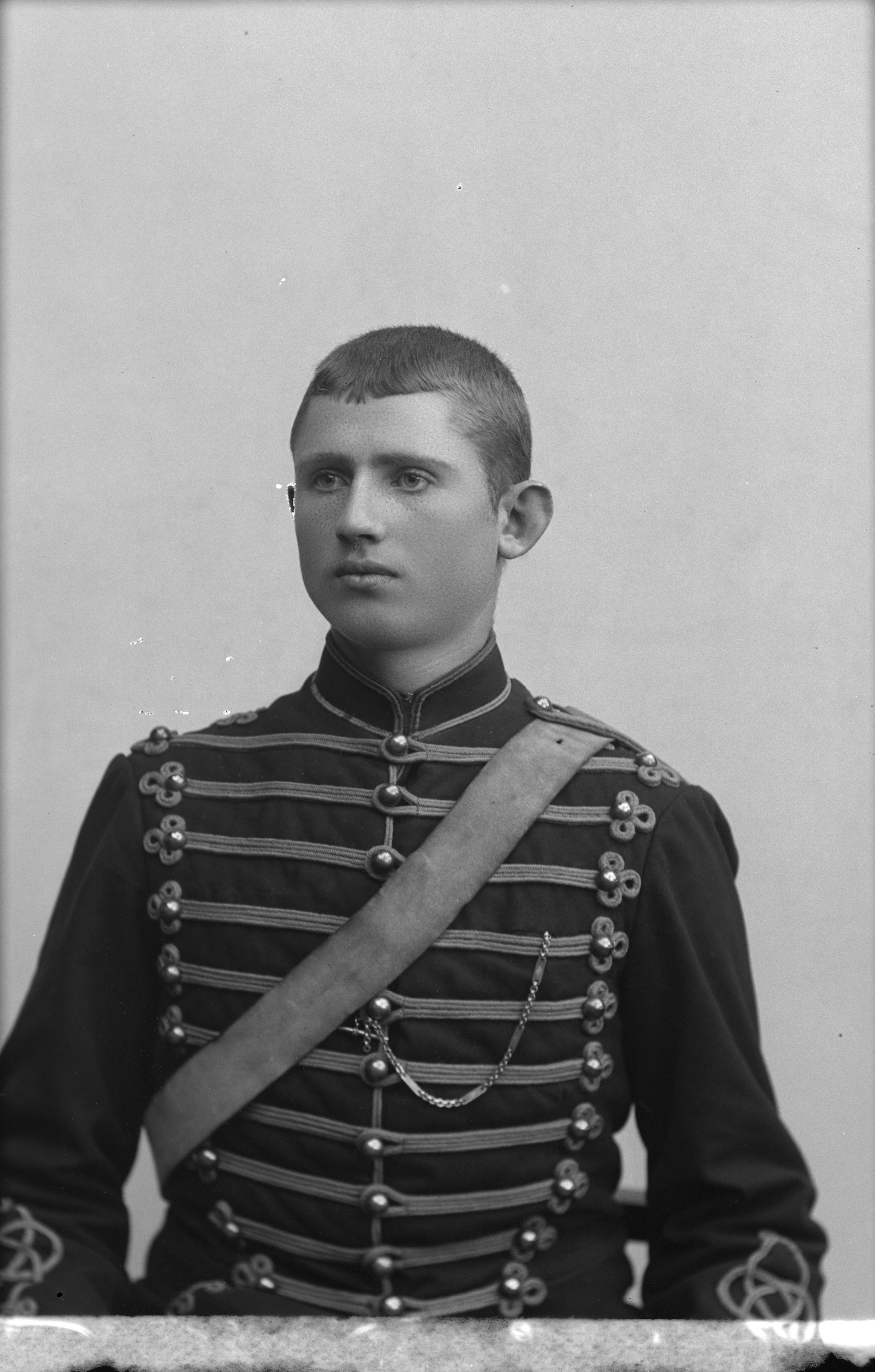 Porträtt i halvfigur av husar Vidén, iklädd militäruniform.