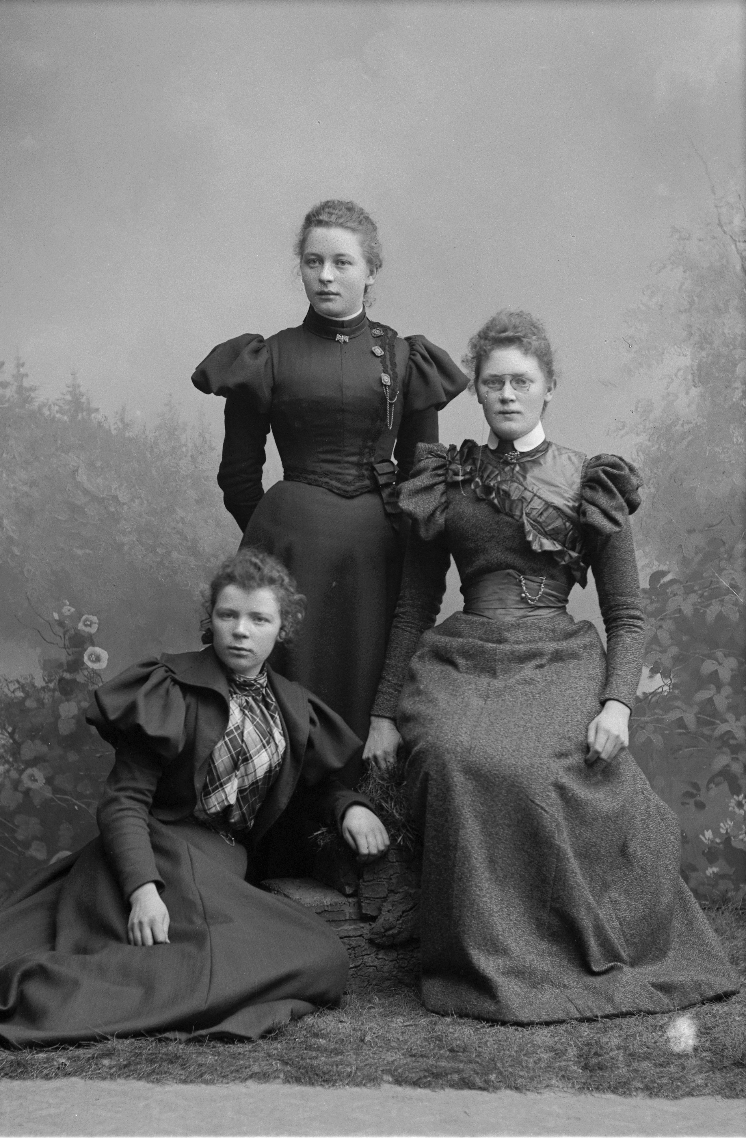 Porträtt i helfigur av Ida Roslund, med okänt sällskap, två andra kvinnor. En av kvinnorna sittande på golvet. Fotograferade framför ateljéfond med skogs- och blomstermotiv.