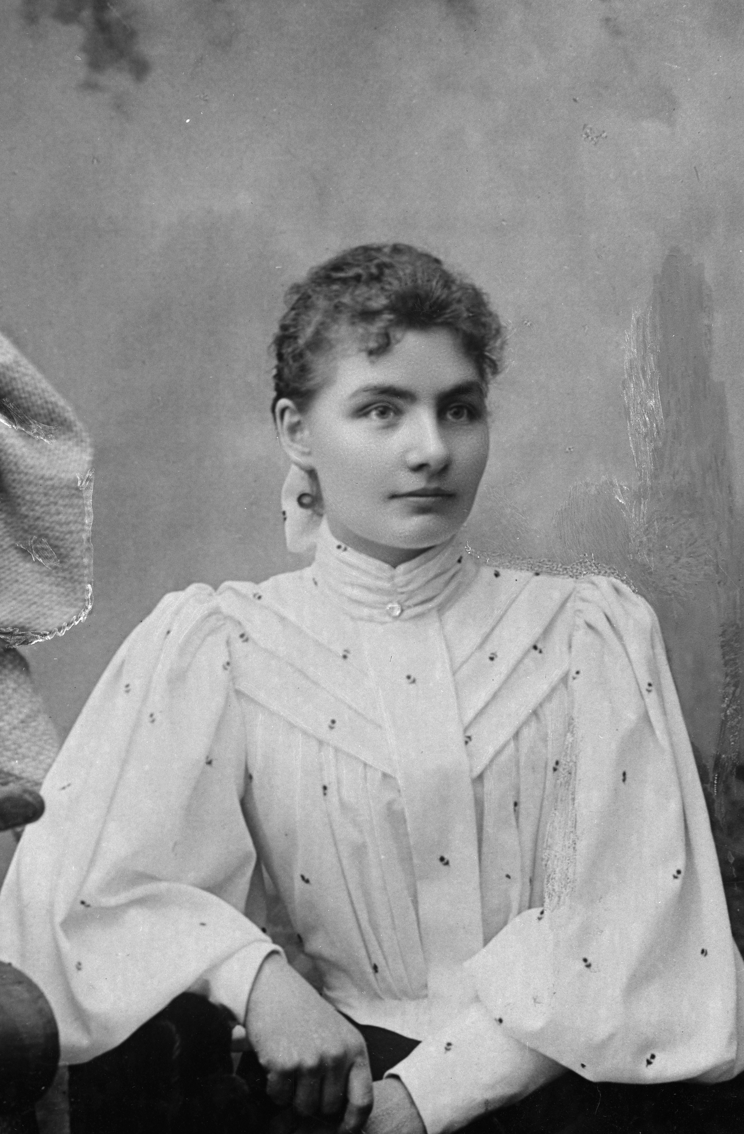Beskrivning: Porträtt i halvfigur av oidentifierad kvinna med rosett i nacken.