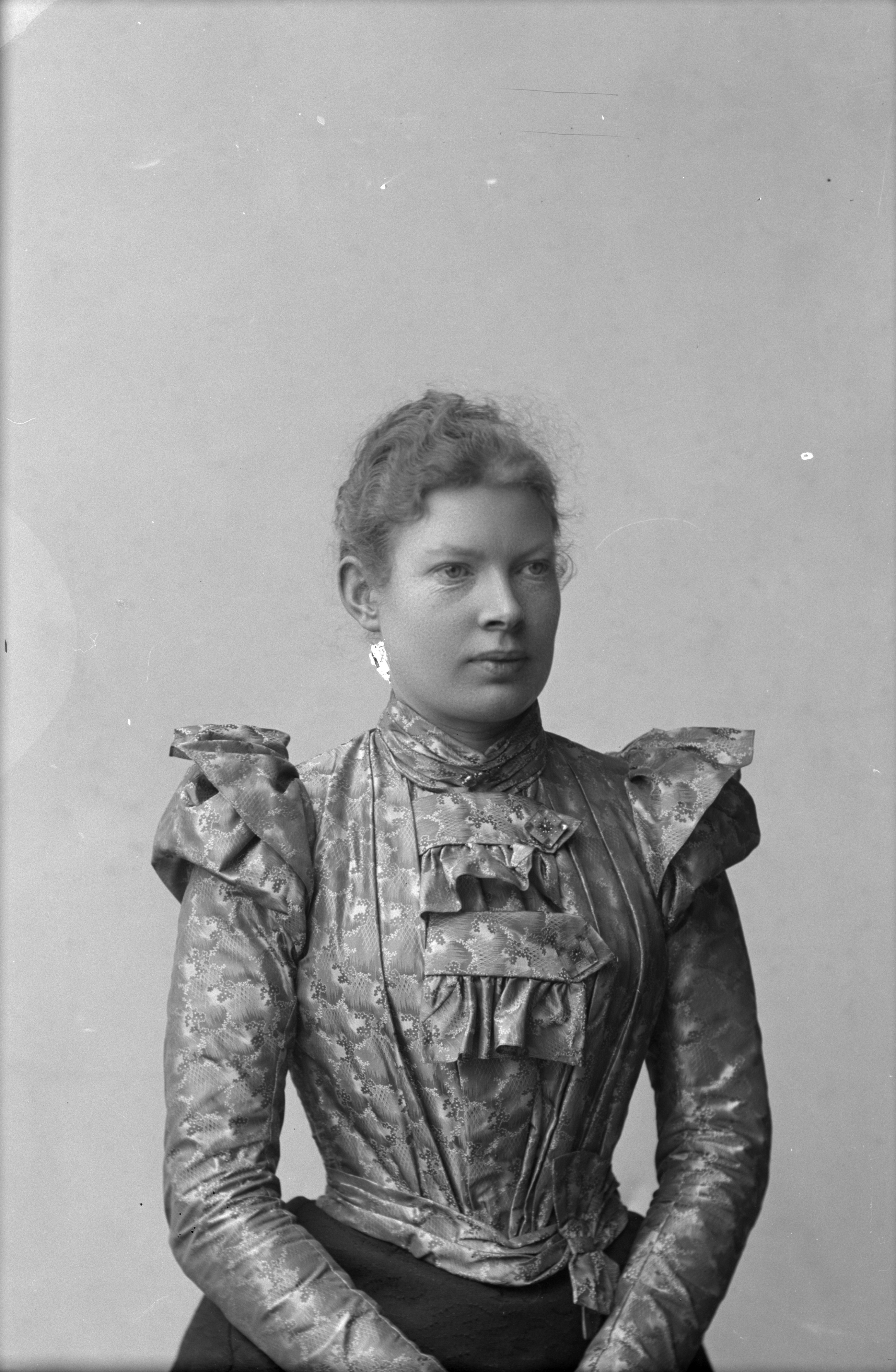 Beskrivning: Porträtt i halvfigur av fröken Rasmusson.