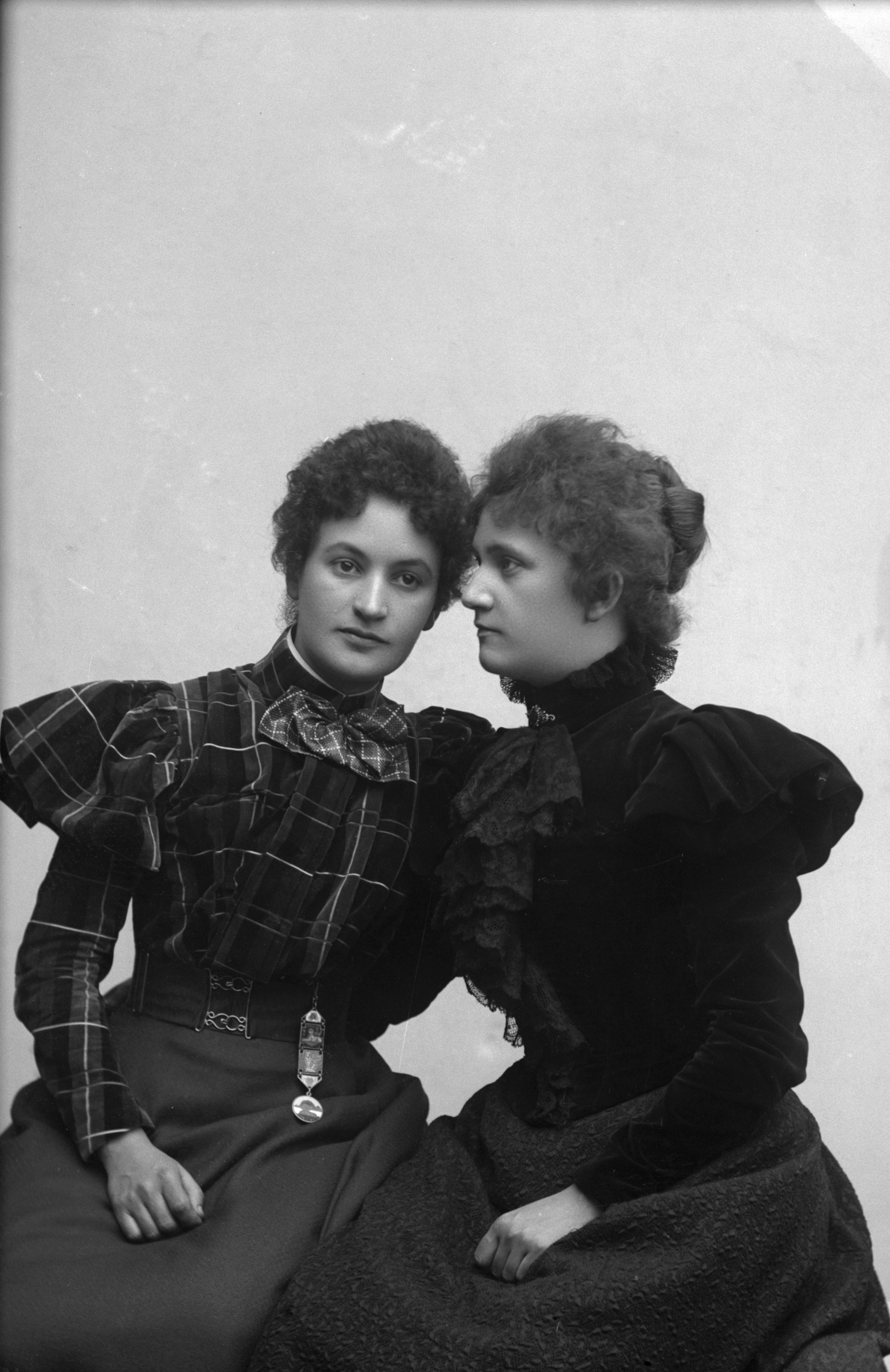 Porträtt i halvfigur av Gerda Sandahl med okänd kvinna. Gerda Sandahl till höger, ansikte i profil.