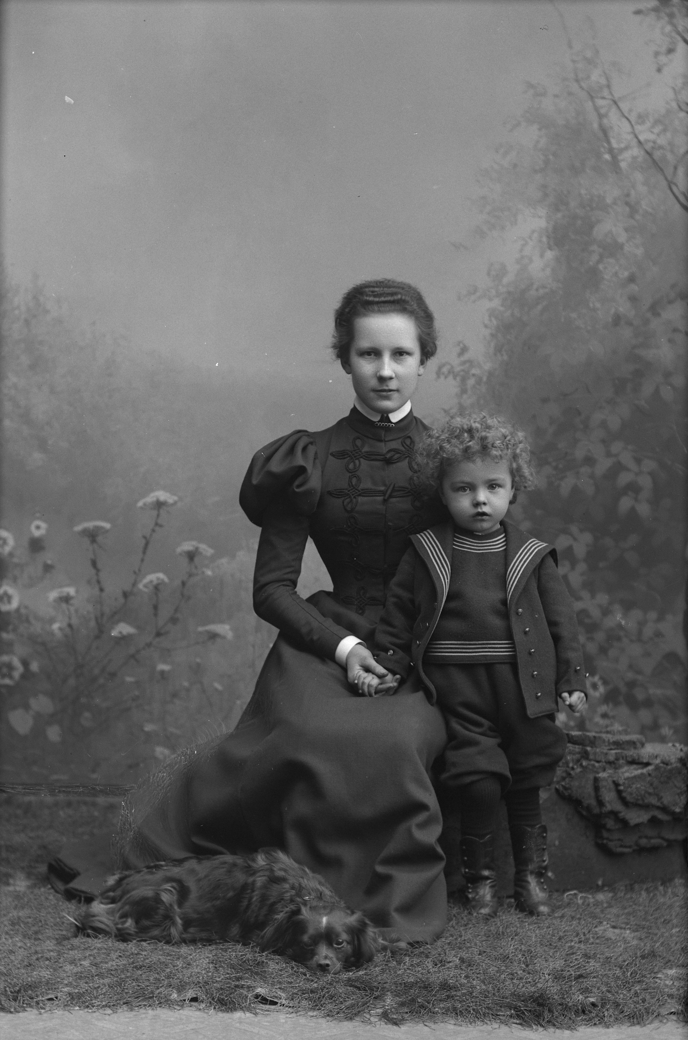 Porträtt i helfigur av barnflickan fröken Assarson med Holmströms son, sittande på klippa. Fotograferade framför ateljéfond med skogs- och blomstermotiv.