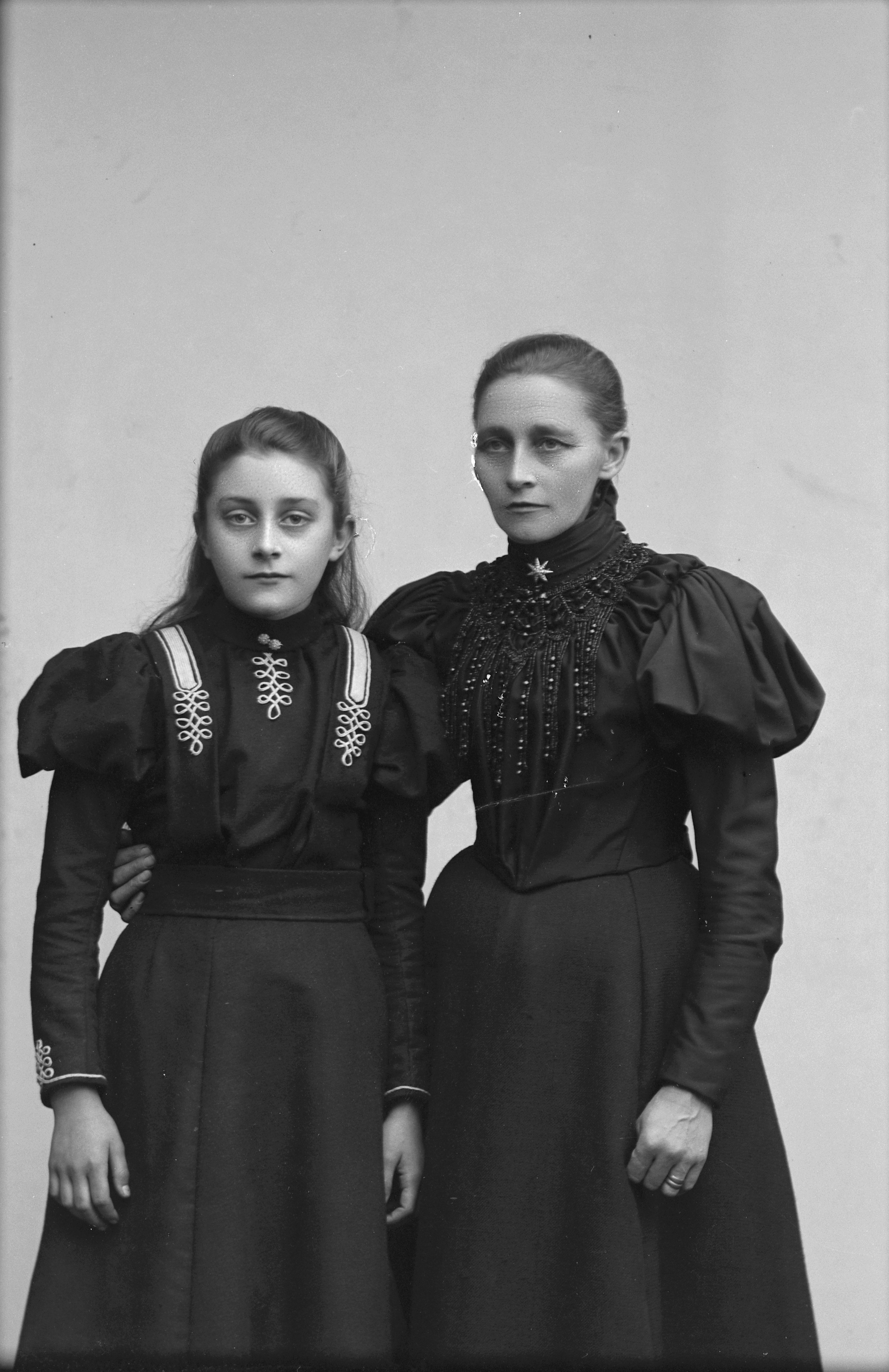 Beskrivning: Porträtt i helfigur av fru Vallhoff med dotter.