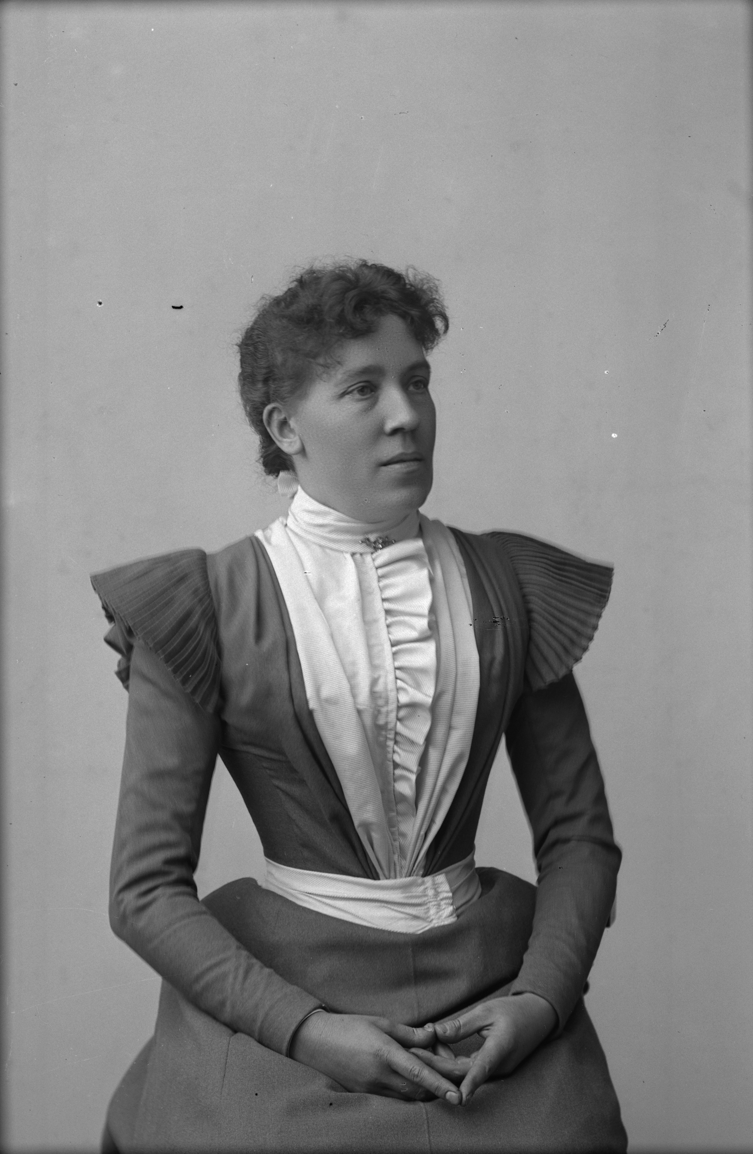 Beskrivning: Porträtt i halvfigur av fröken Öhrström.