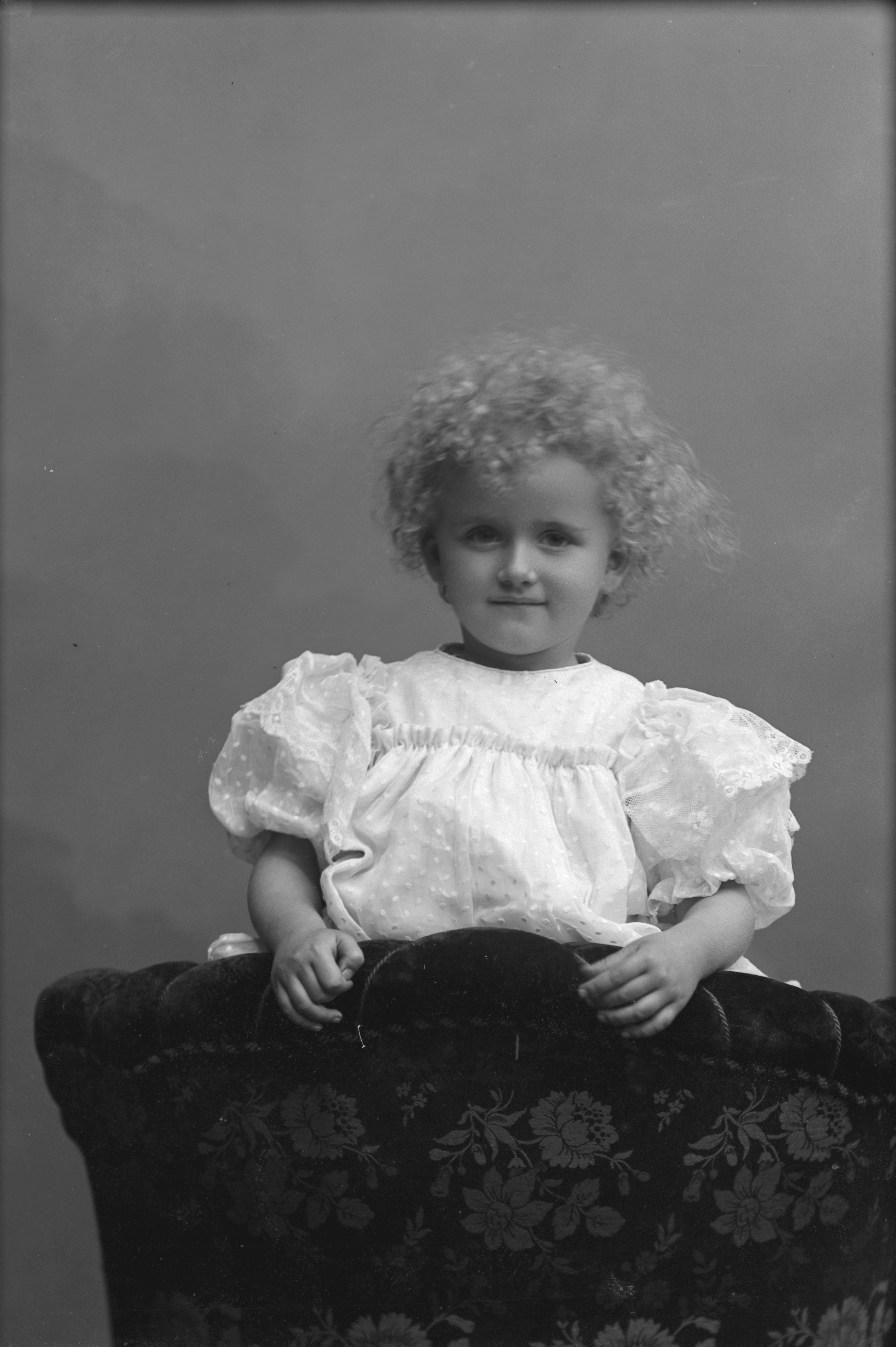 Porträtt i halvfigur av Gleerups dotter, stående på soffa.