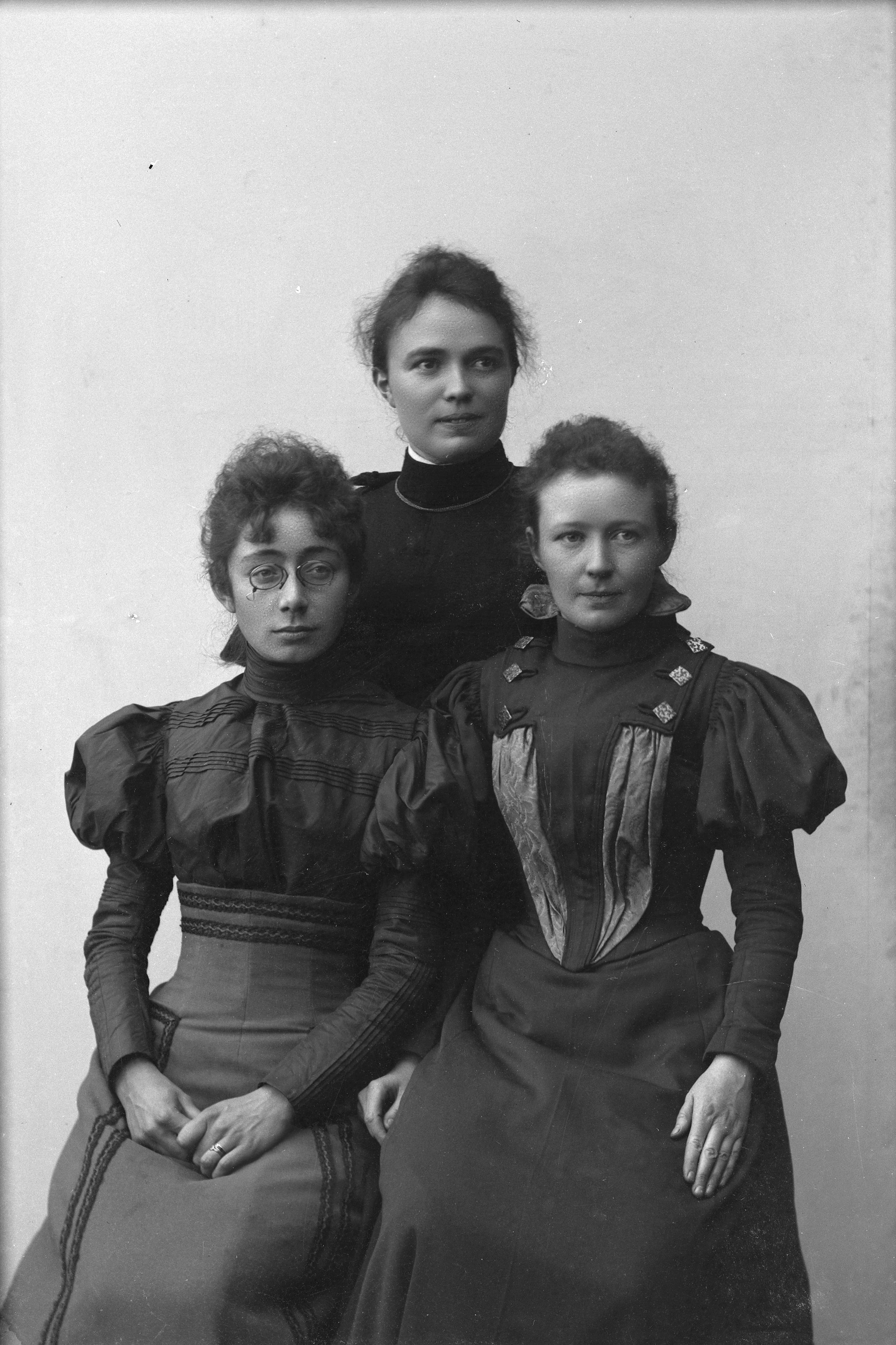 Porträtt i helfigur av fröken Djurberg med okänt sällskap, två andra kvinnor, sittande och stående.