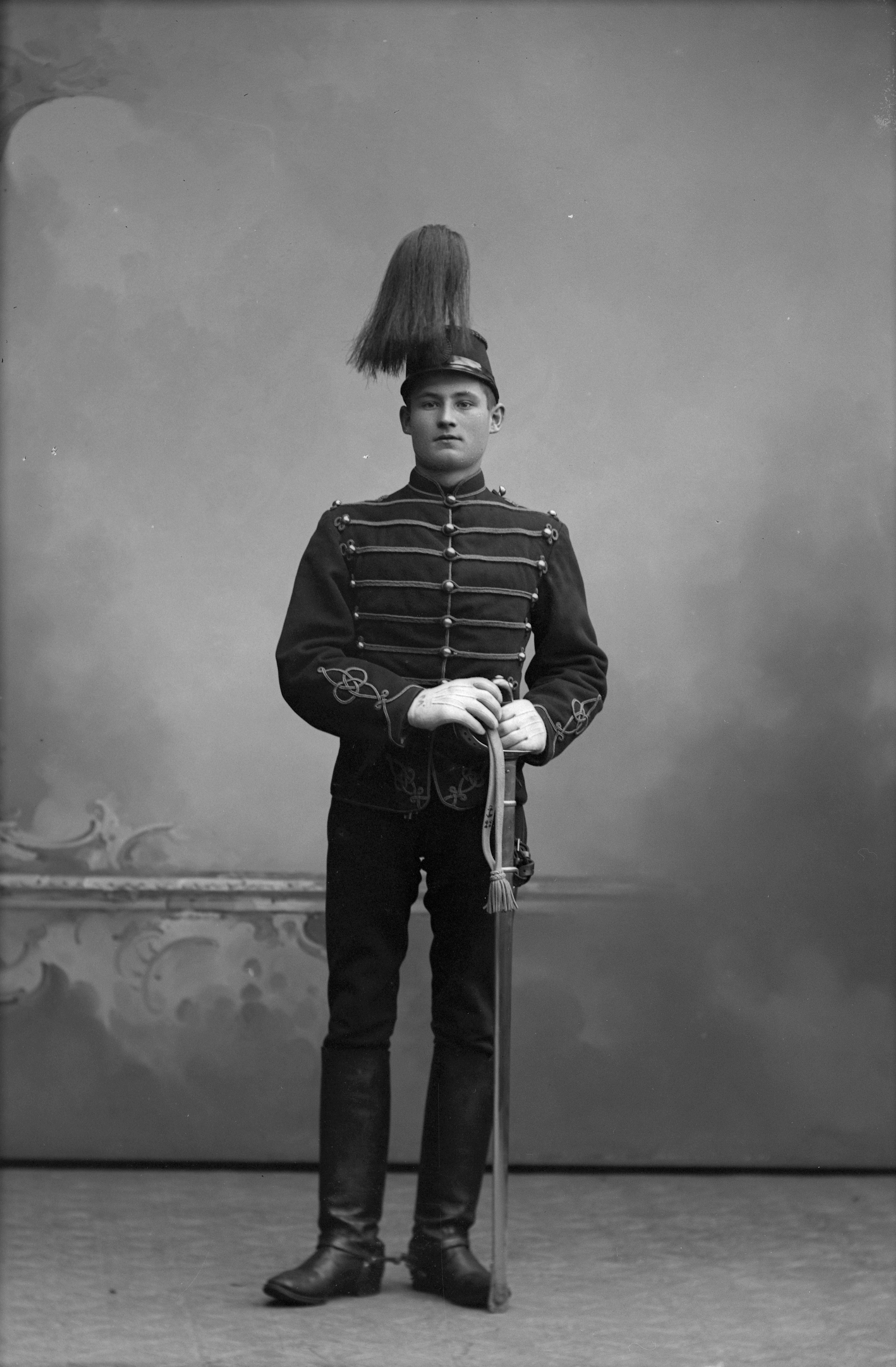 Porträtt i helfigur av Johan Ludvig Alfredsson Svedberg, iklädd militäruniform och plymförsedd hjälm, hållande sabel.