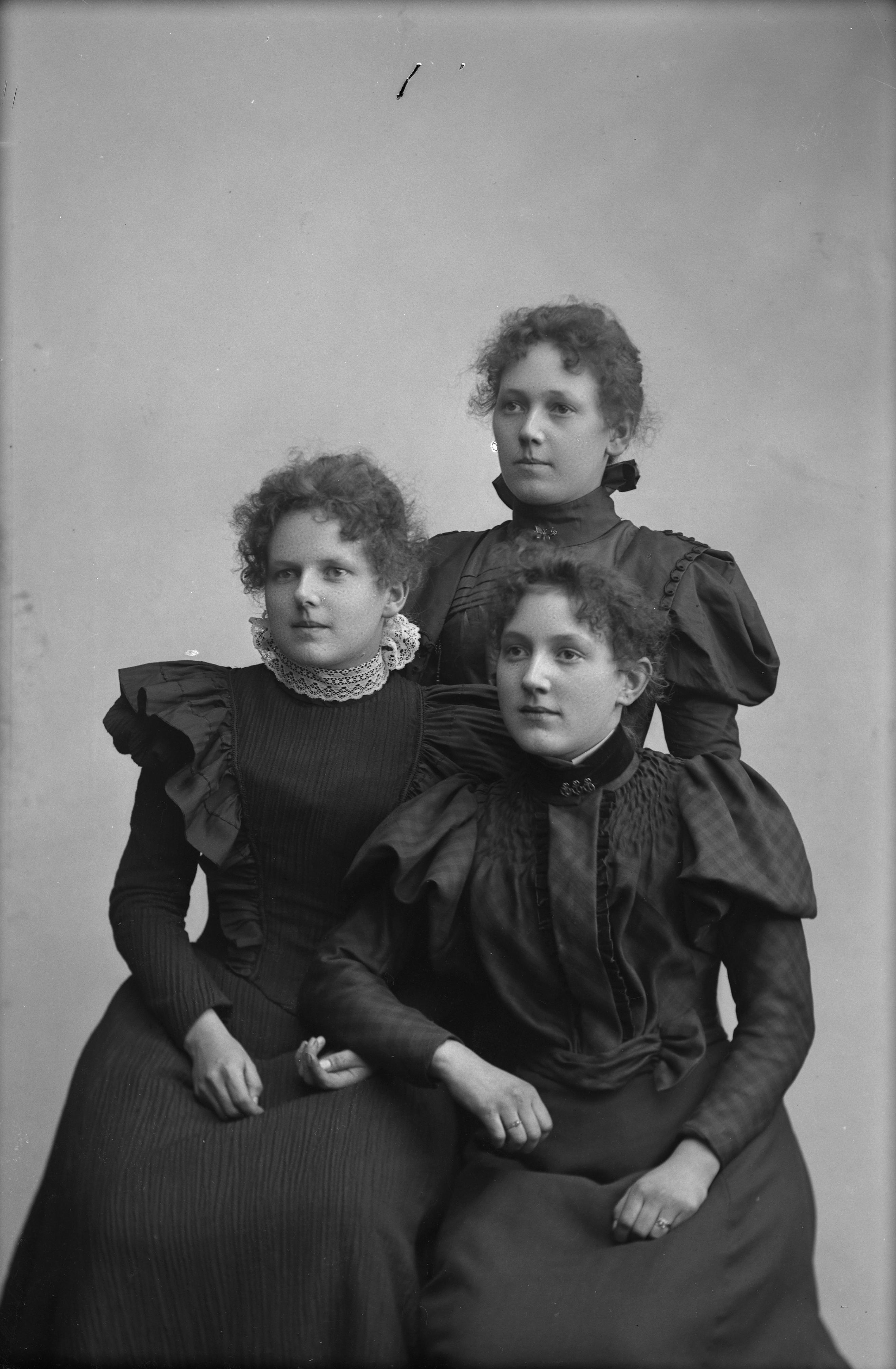 Porträtt i helfigur av Emma Persson med okänt sällskap, två andra kvinnor.