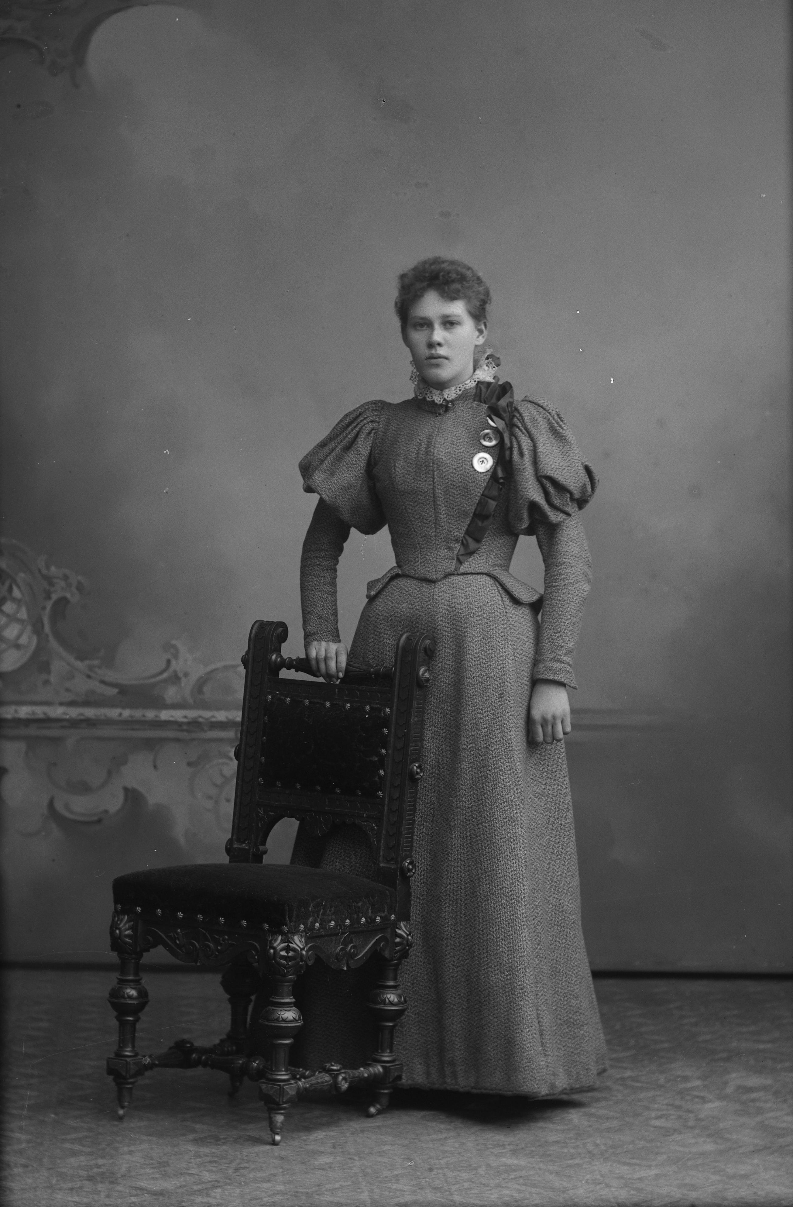 Porträtt i helfigur av Ida Rosberg, stående vid stol.