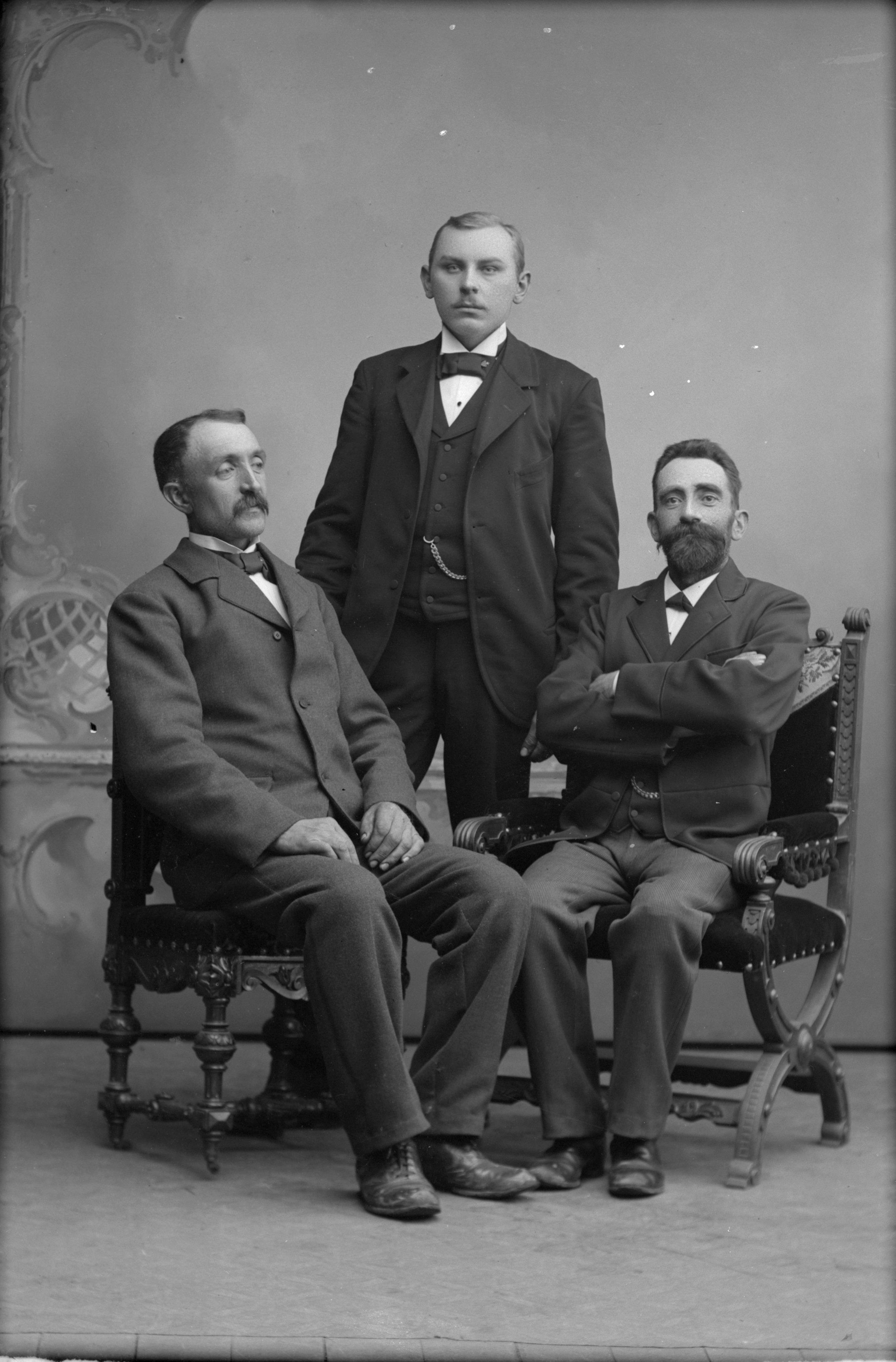 Porträtt i helfigur av herr Jeppsson, Albert Larsson med okänd man. Albert Larsson stående.