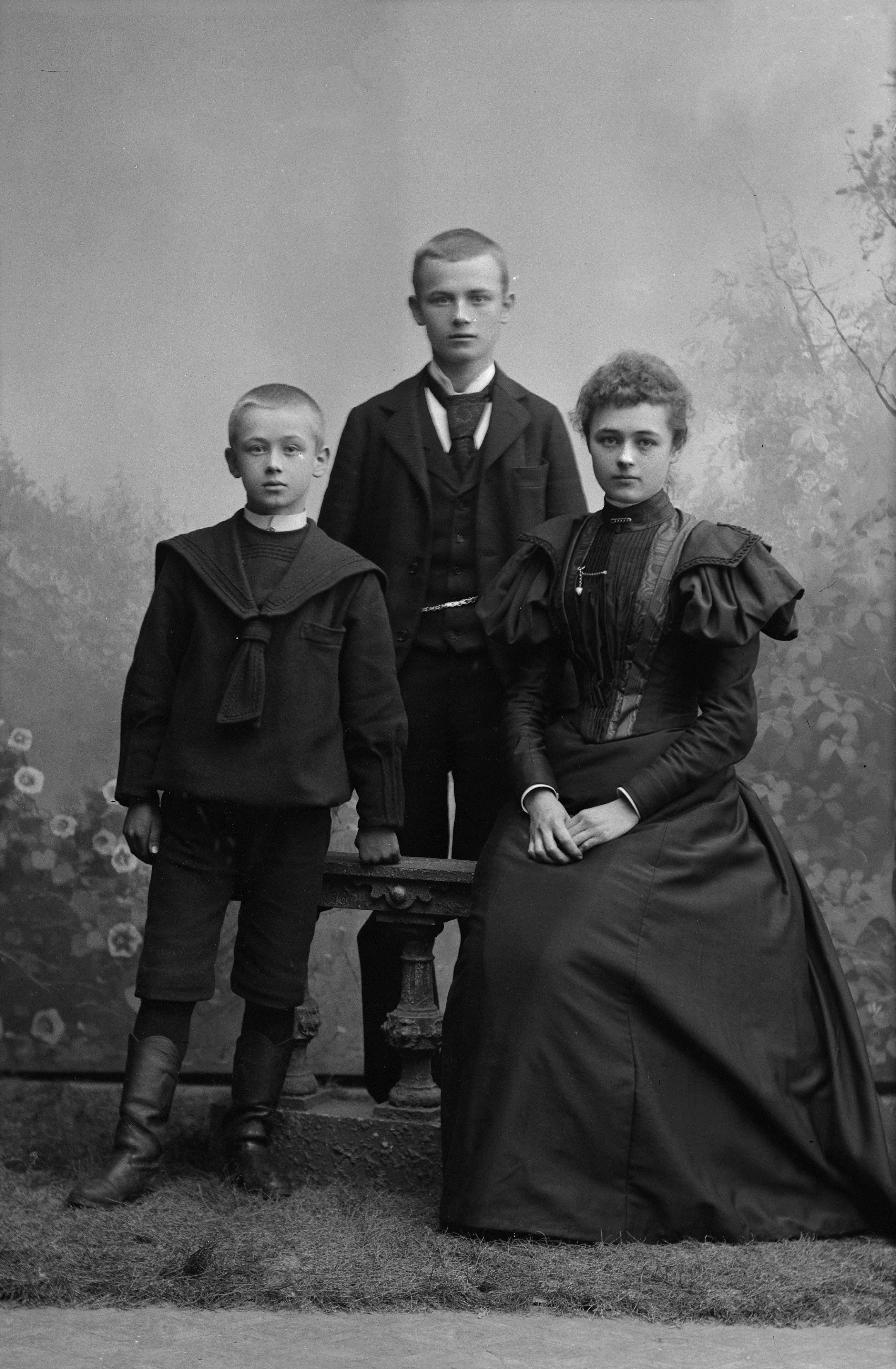 Porträtt i helfigur av Gerda Rosander med två okända pojkar, vid stenstaket. Gerda Rosander sittande, den yngste pojken iklädd sjömanskostym. Fotograferade framför ateljéfond med skogsmotiv.