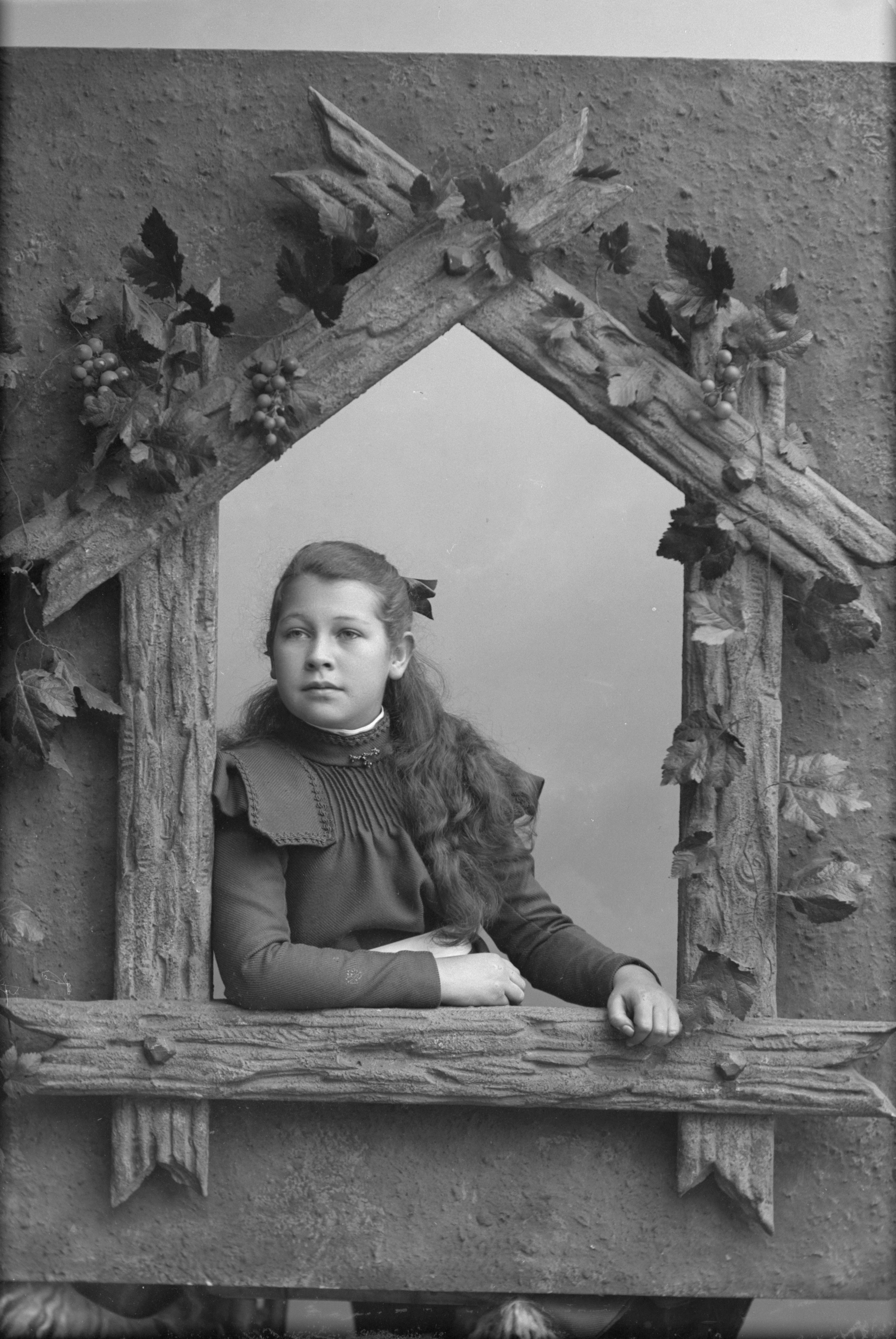 Porträtt i halvfigur av Kleins dotter, fotograferad stående i fönsterkuliss dekorerad med vinranka.