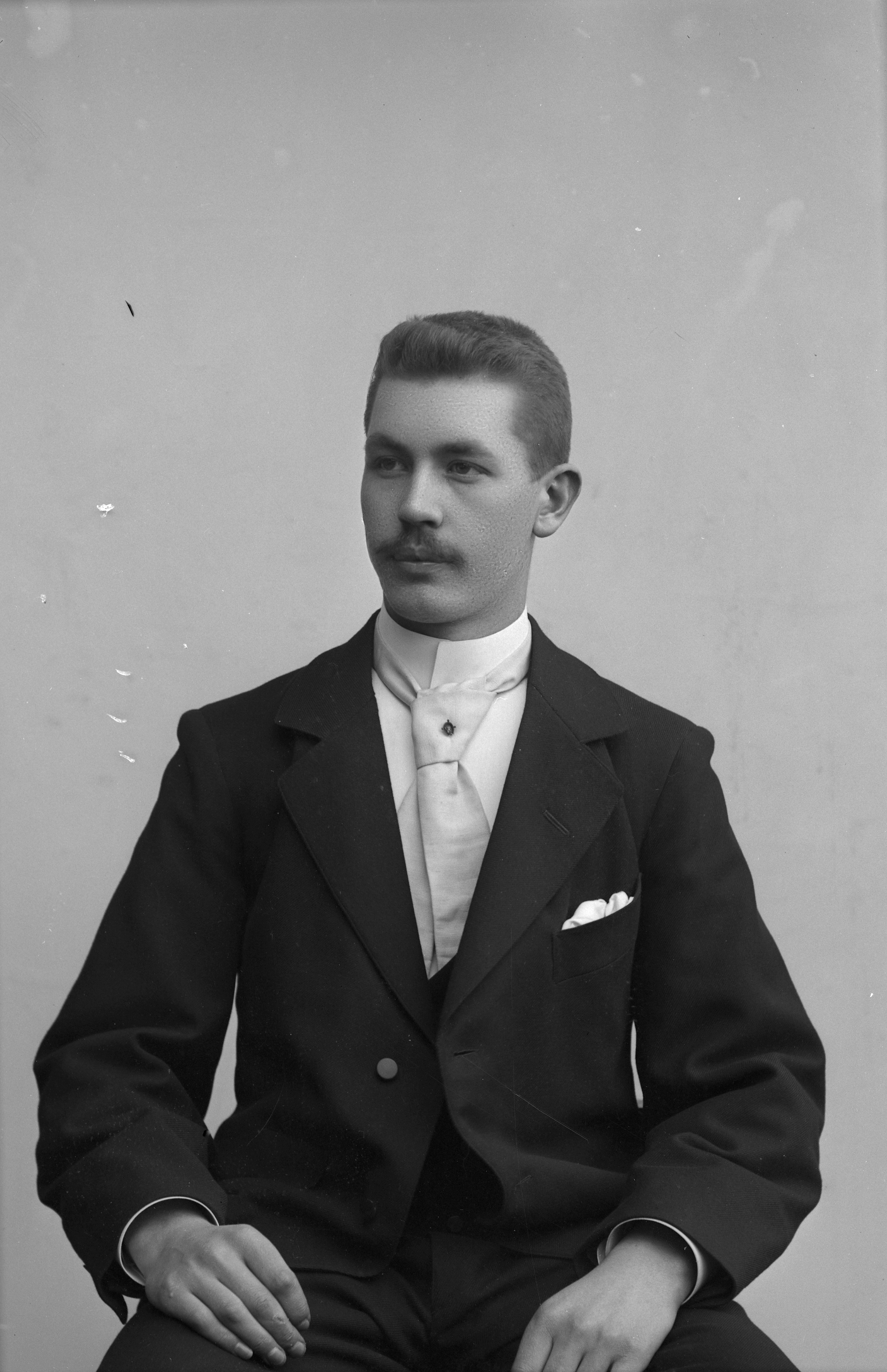 Beskrivning: Porträtt i halvfigur av J. Samuelsson vid Browns Conditori-Trädgård.