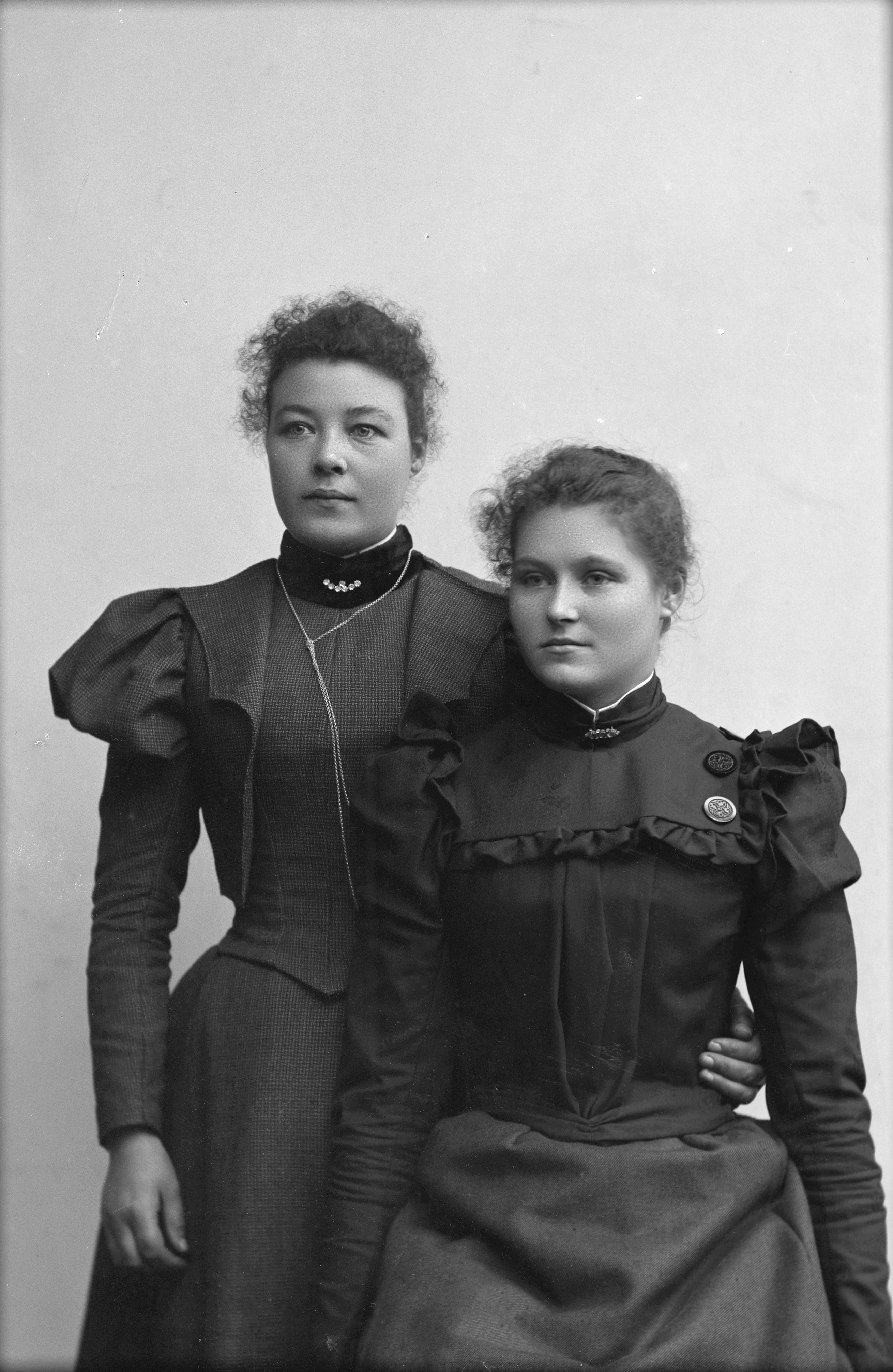 Beskrivning: Porträtt i helfigur av Hanna Jönsson med okänd kvinna. En av kvinnorna sittande.