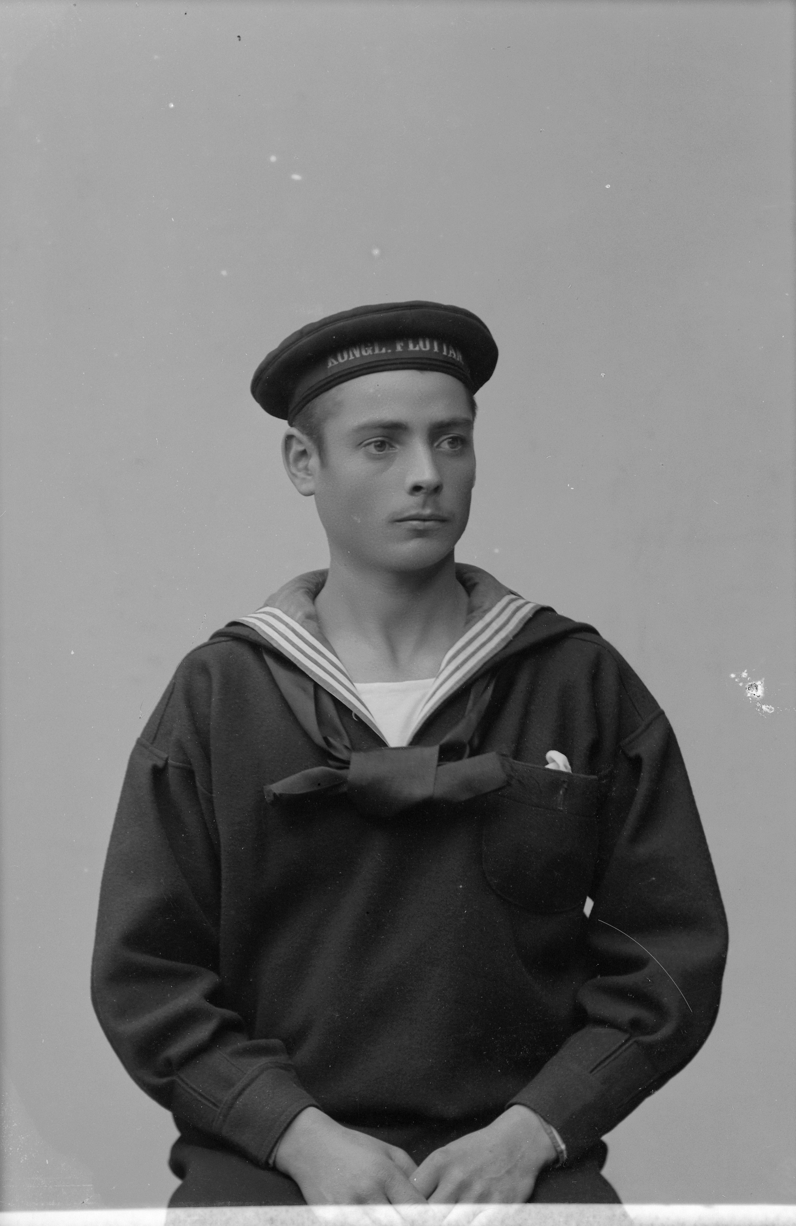 Porträtt i halvfigur av sjömannen A. Landgren, iklädd sjömanskostym och -mössa med "Kongl. Flottan" inbroderat.