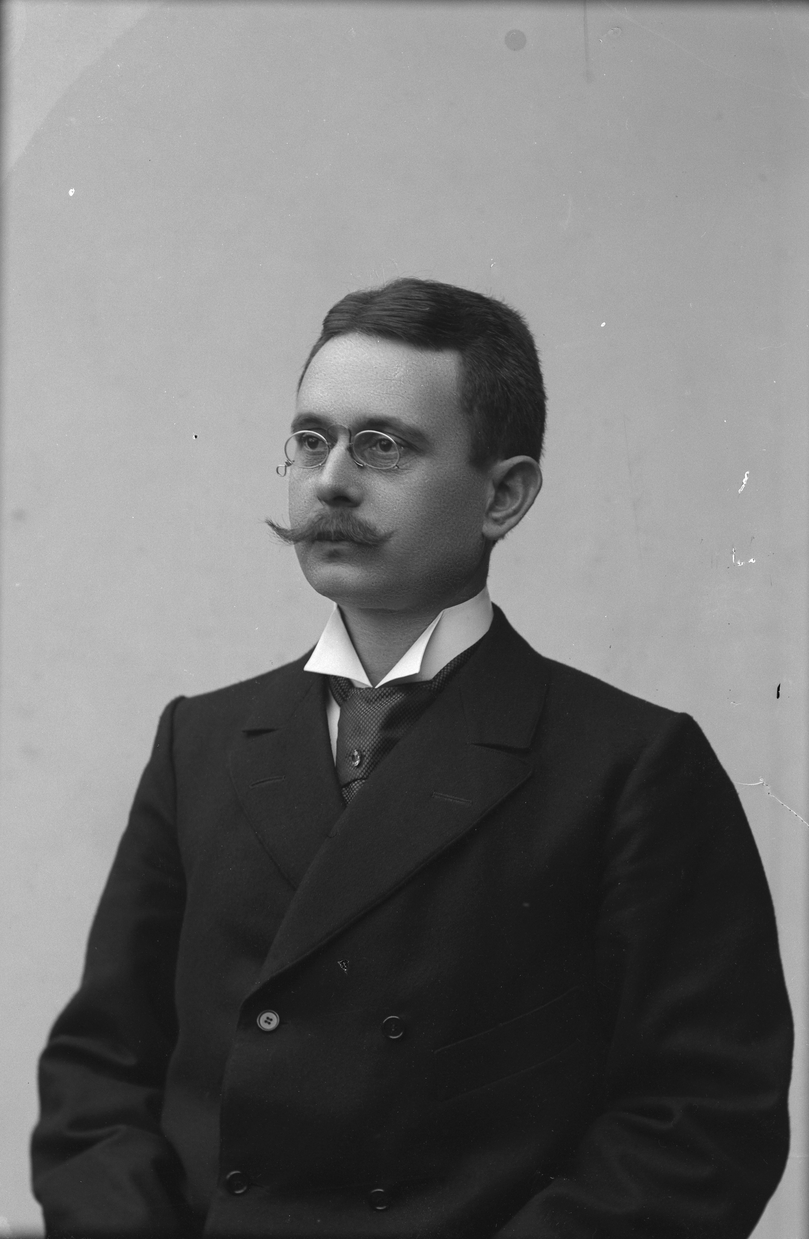 Beskrivning: Porträtt i halvfigur av August Lindell.