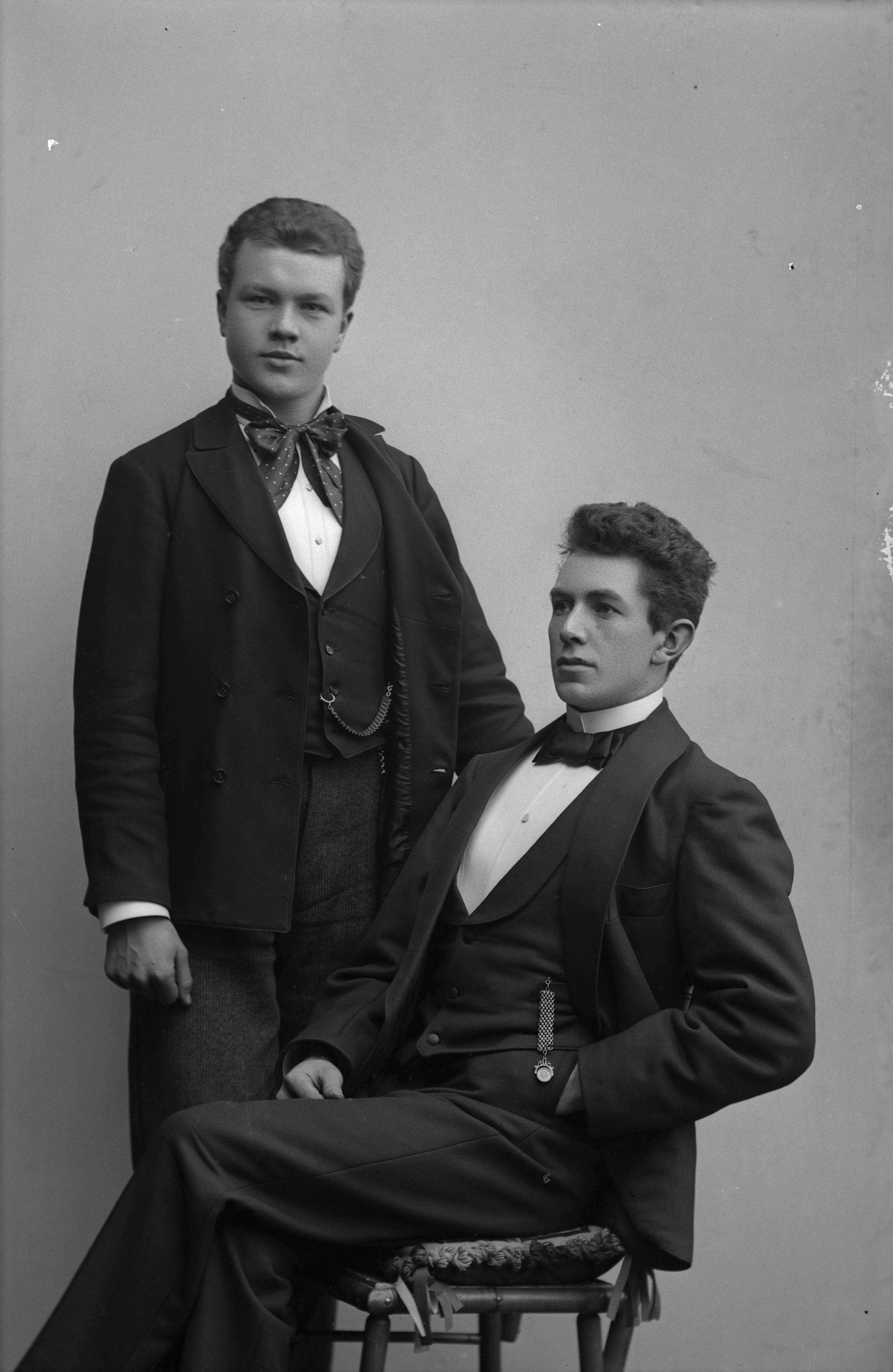 Beskrivning: Porträtt i helfigur av herr Nilsson och herr Olsson. Herr Nilsson sittande i stol.