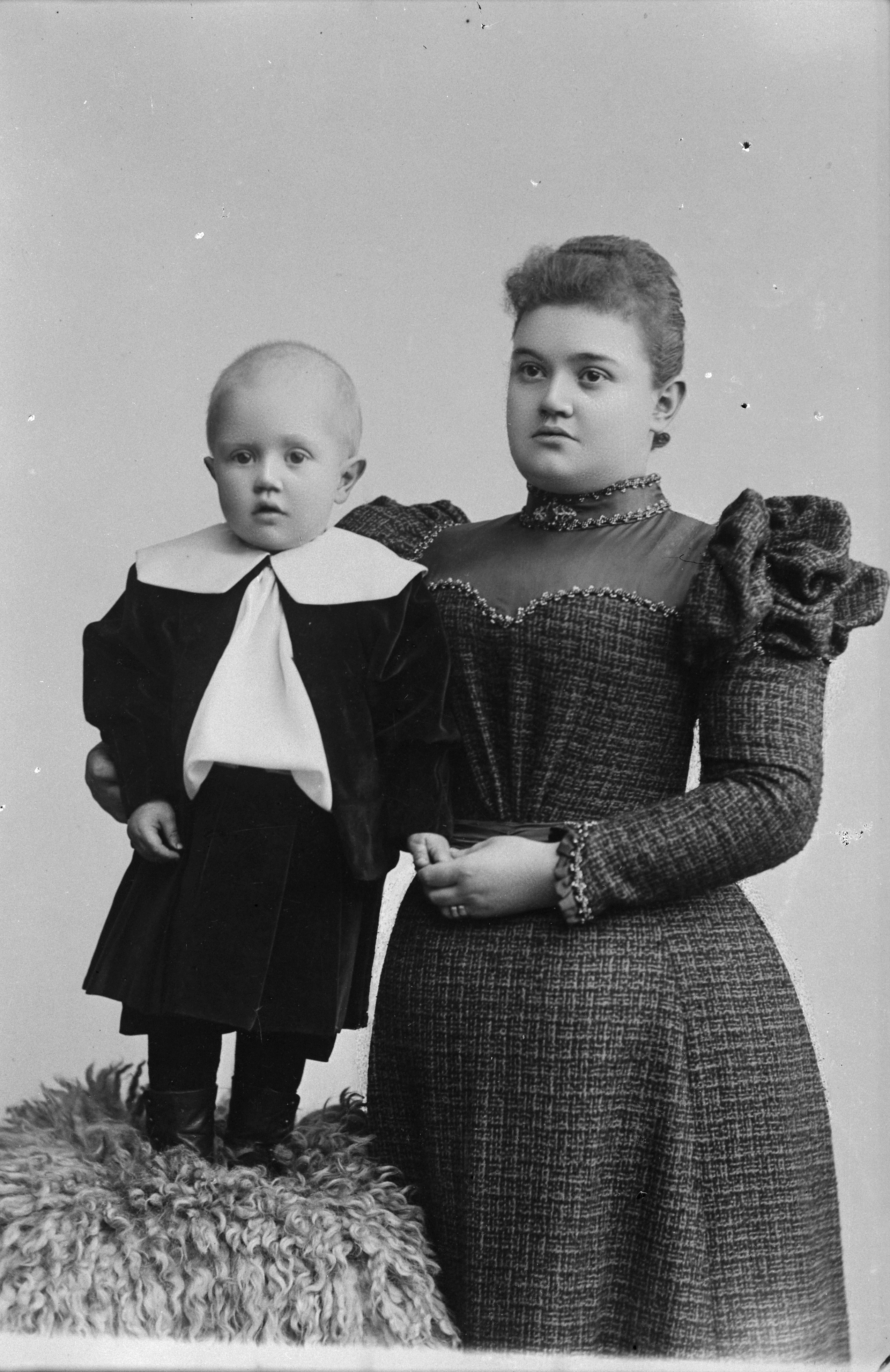 Porträtt i helfigur av fru Lindeberg med sin son. Sonen stående på fäll, bredvid modern.