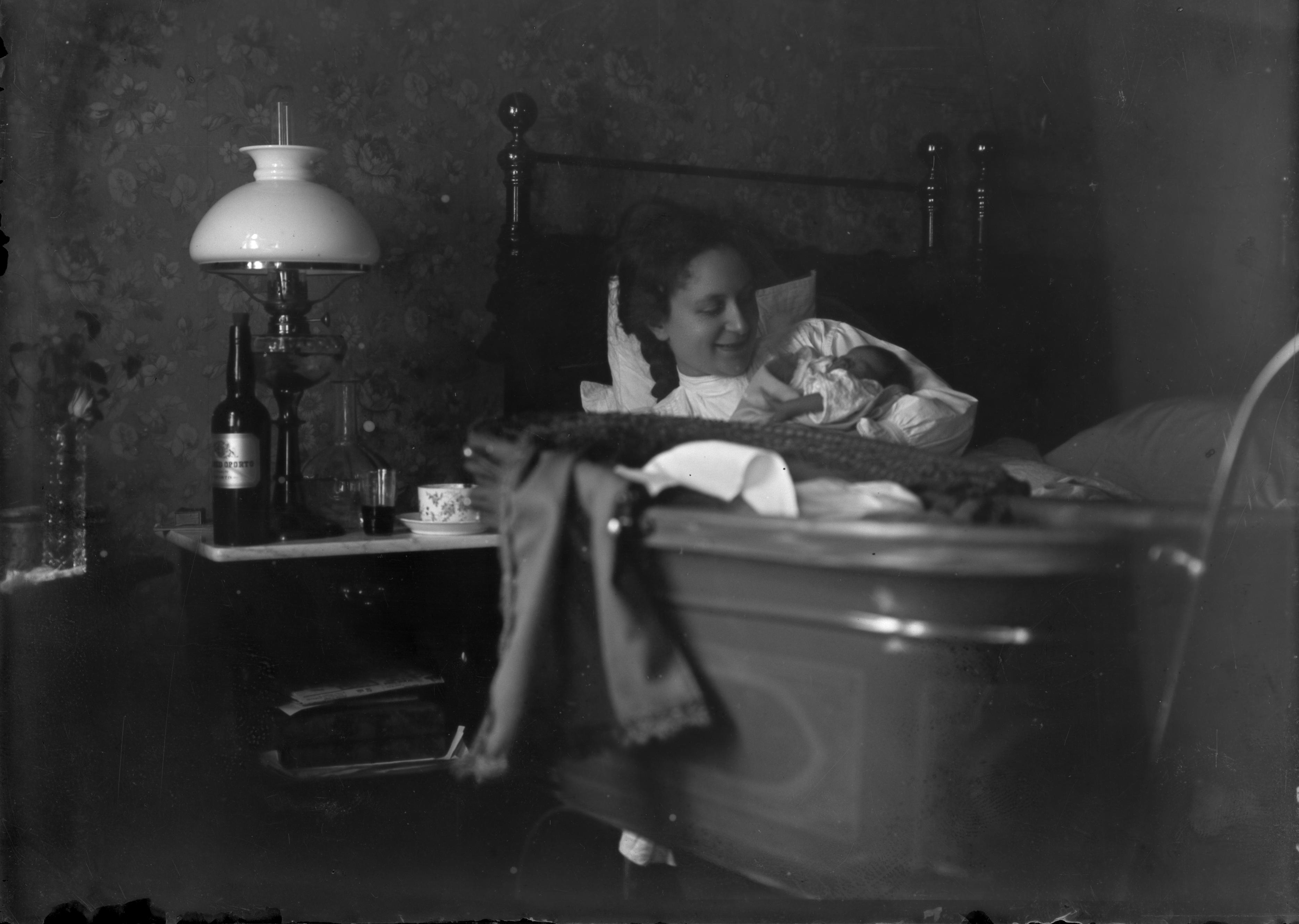 Porträtt av Selma Sjöberg med ett av barnen, liggande i badkar.