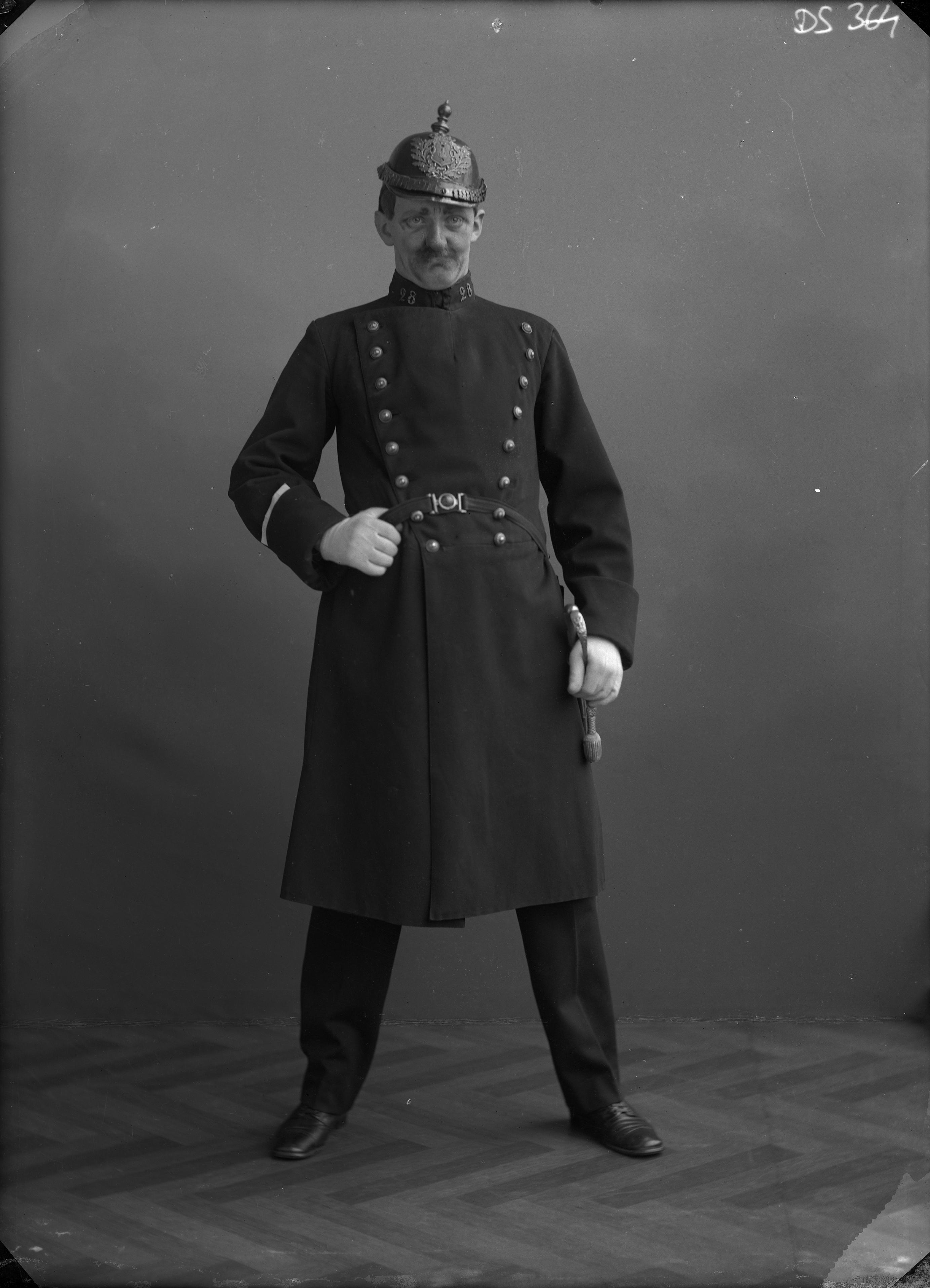 Porträtt i helfigur av medlem ur Lianders teatersällskap, man i polisuniform.