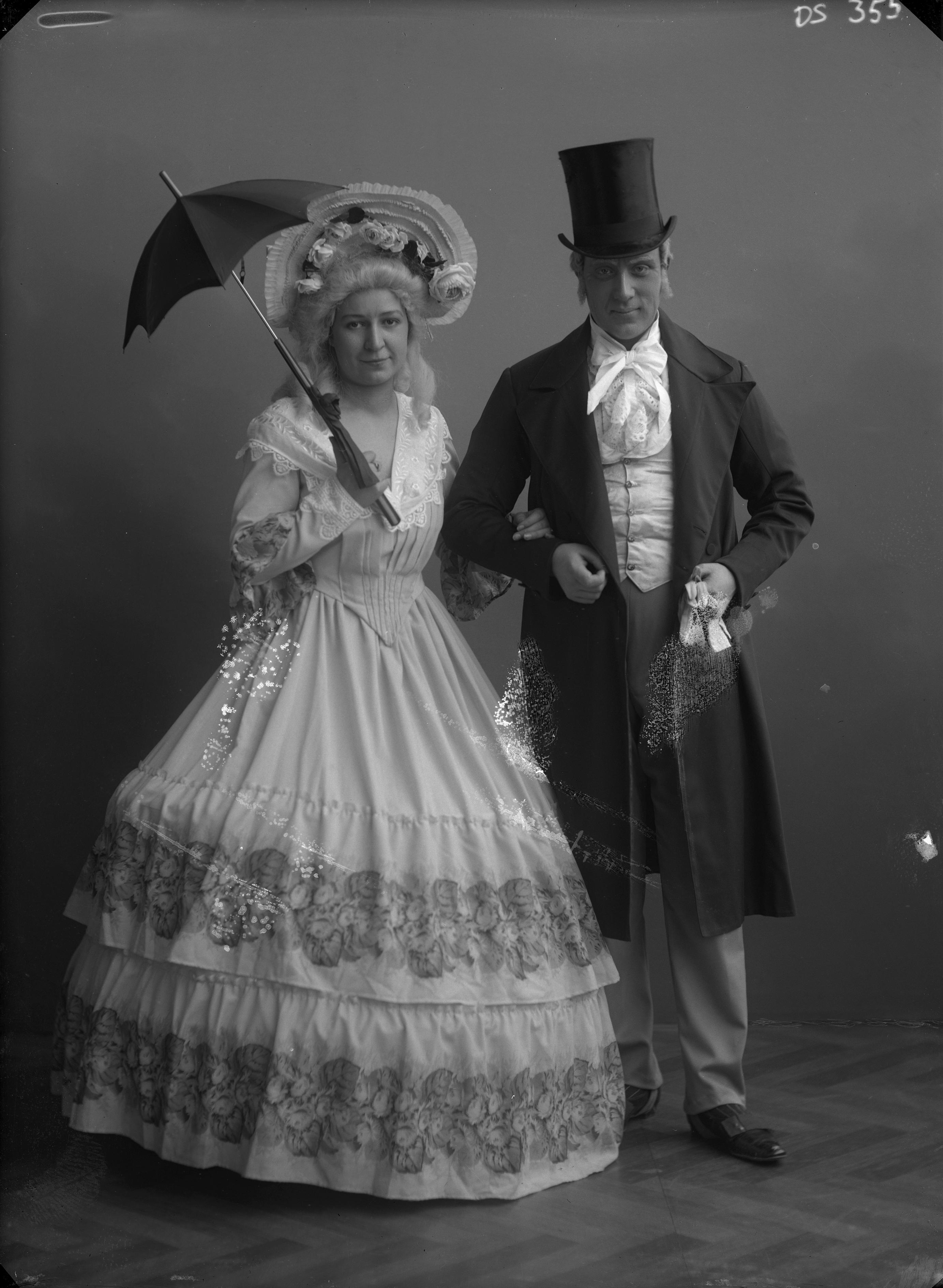 Porträtt i helfigur av medlemmar ur Lianders teatersällskap, "Fröken Hagman" och "Herr Zetterman".