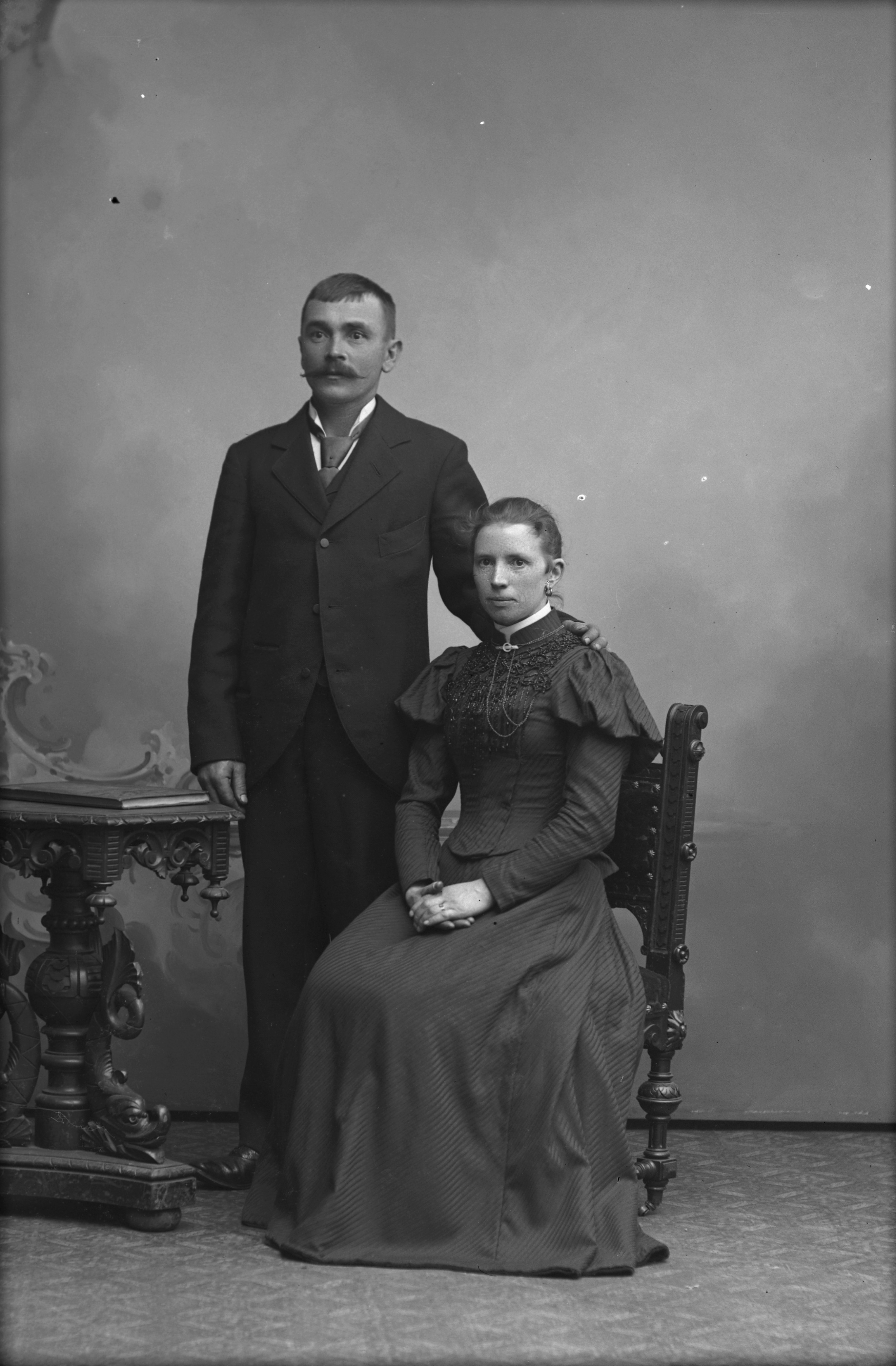 Porträtt i helfigur av Karin Andersson med okänd man, möjligen Fritz Flensburg. Karin Andersson sittande, mannen stående vid skulpterat pelarbord (i nyrenässans). På bordet ligger en bok.