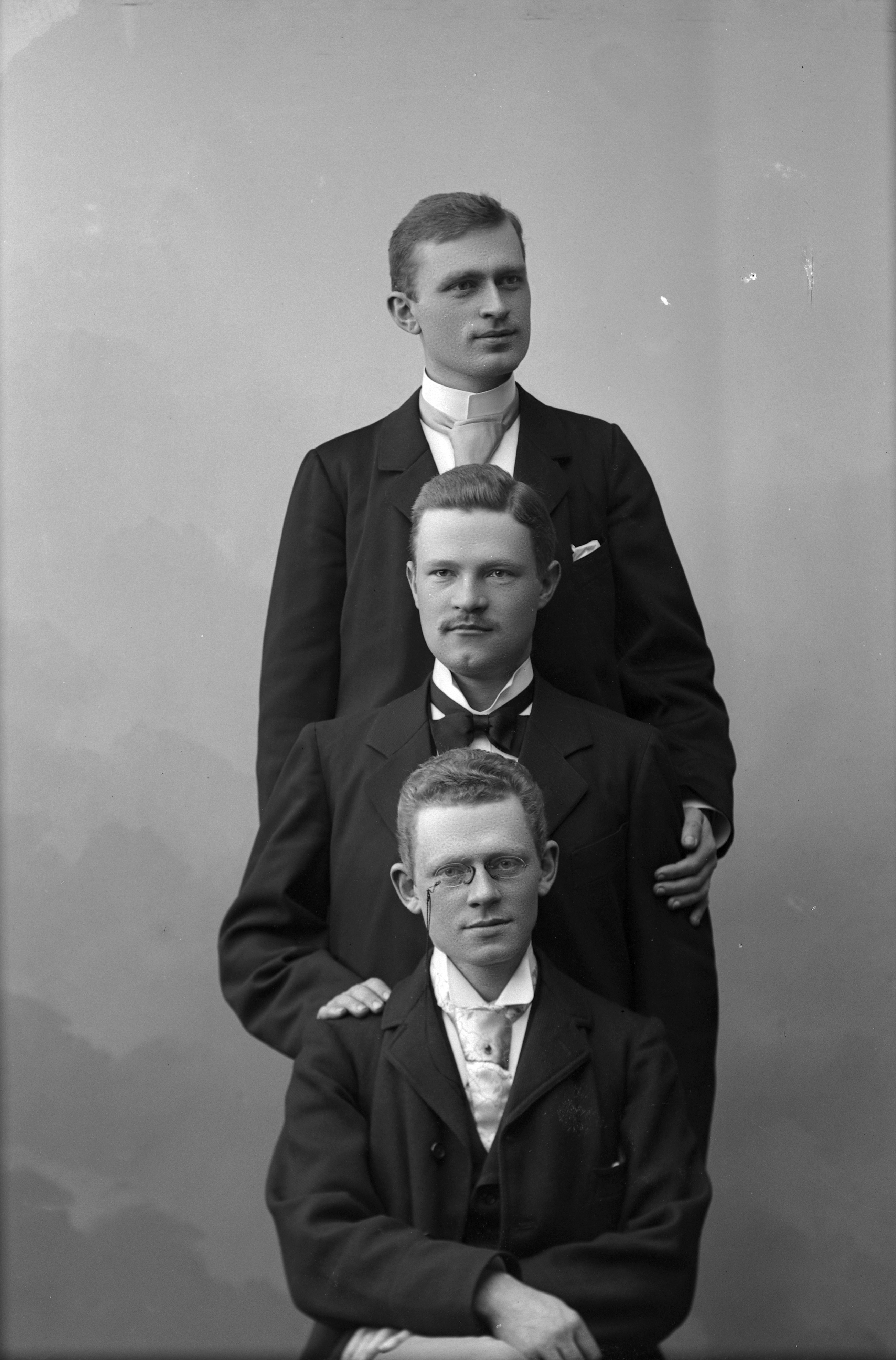 Porträtt i helfigur av högskolestuderande Pontén, Samuel Svensson samt okänd man, stående bakom varandra på rad.