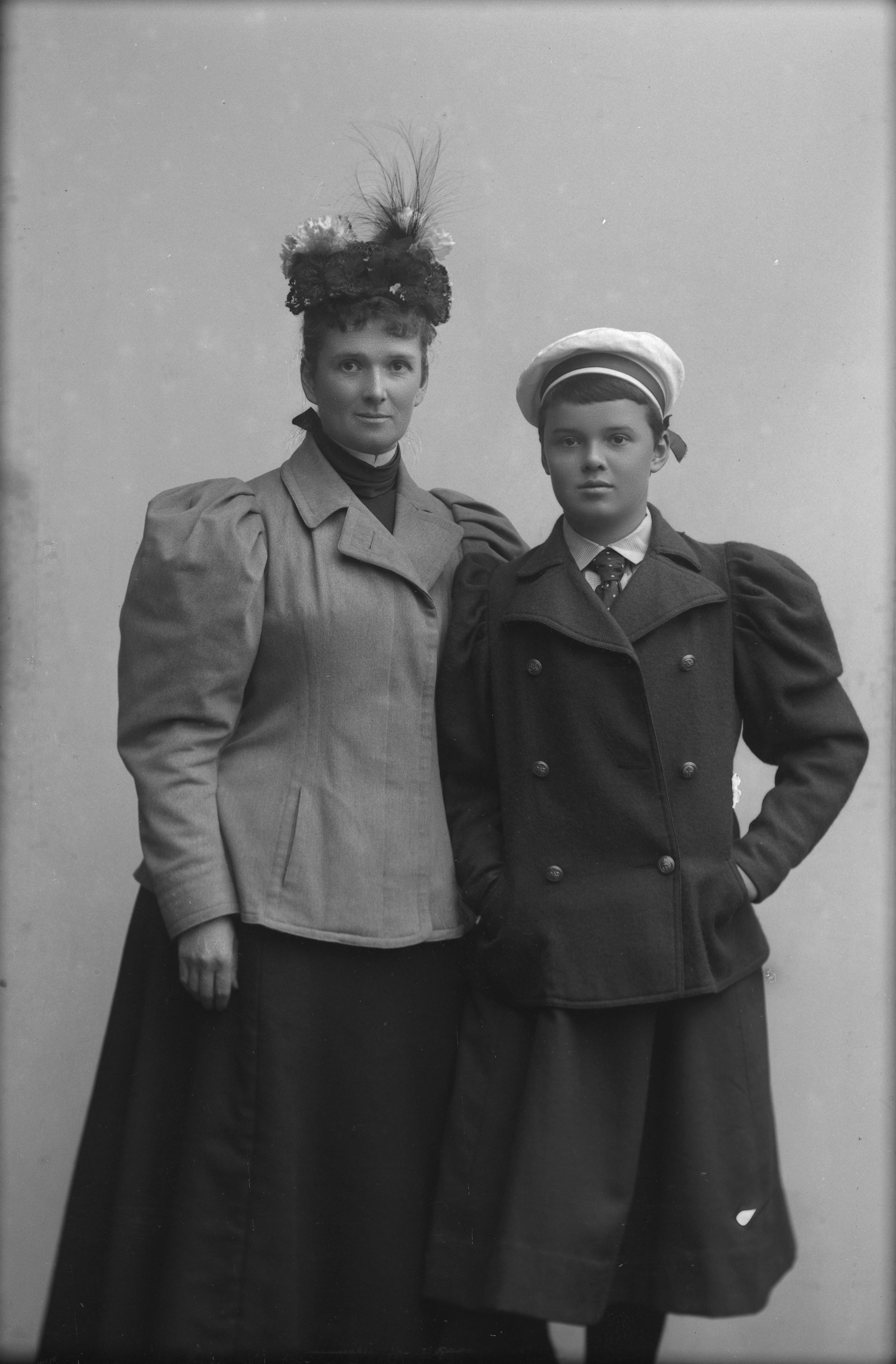 Porträtt i helfigur av fru Berg von Linde med dotter, båda iklädda hattar och kappor.