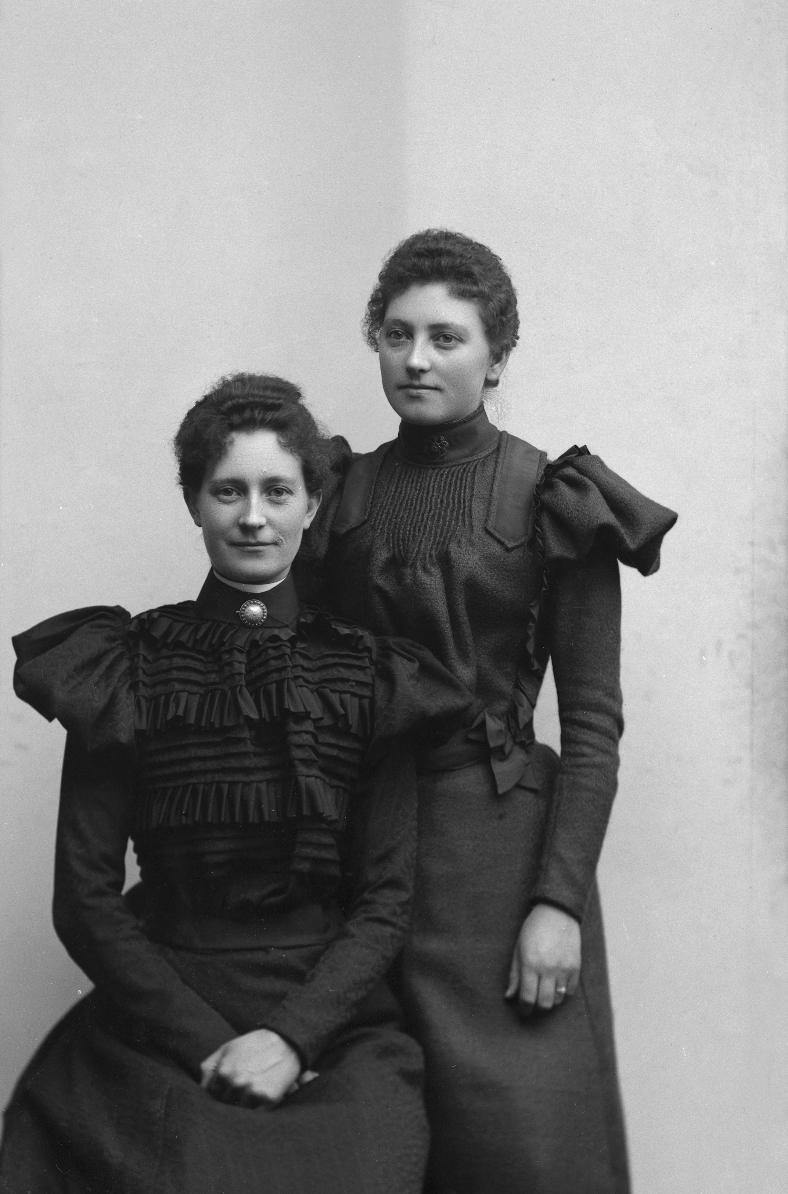 Beskrivning: Porträtt i helfigur av Maria och Martha Persson. Martha Persson stående.