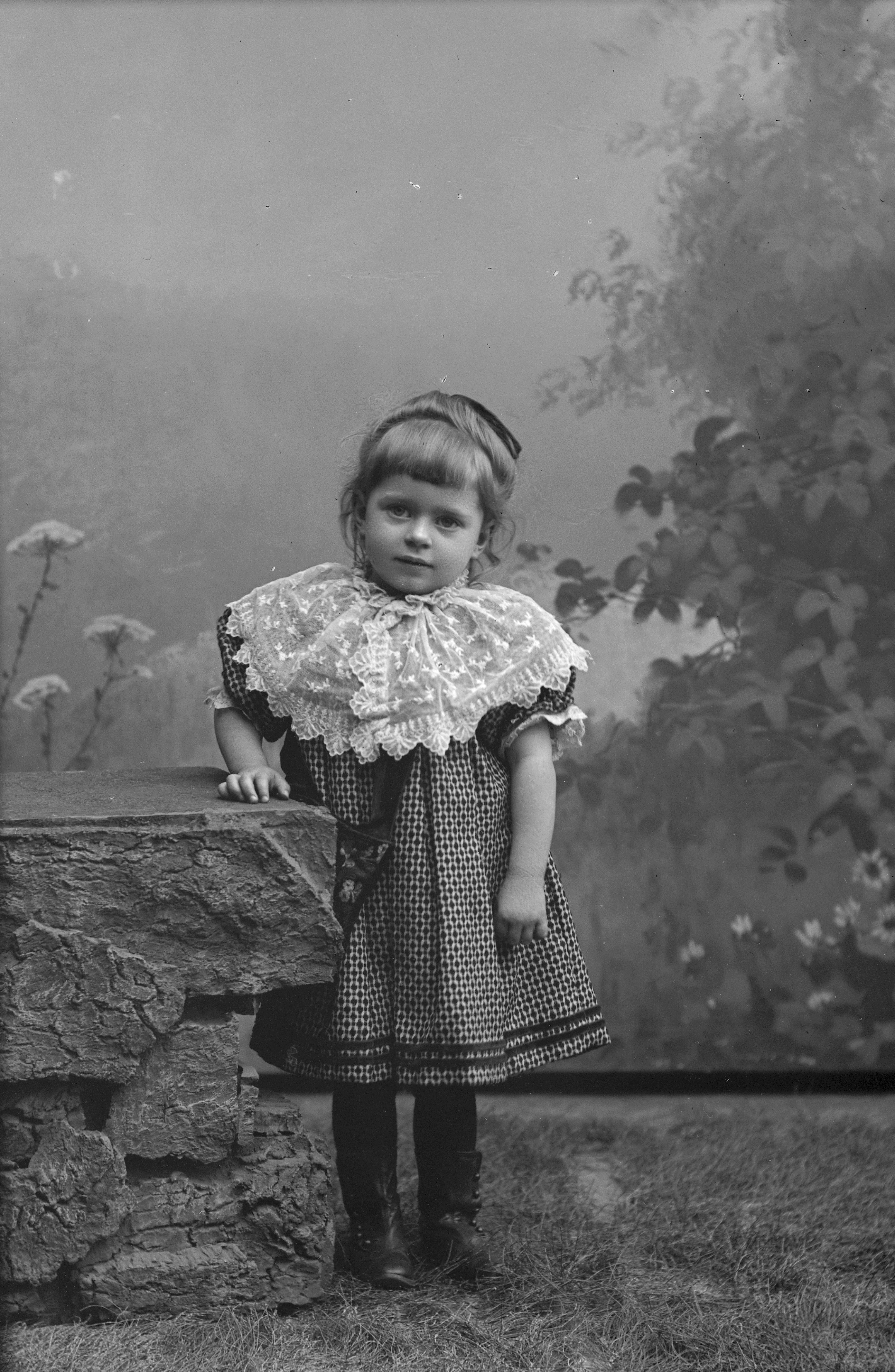 Porträtt i helfigur av Lundbergs dotter, stående vid tegelmur. Fotograferad framför ateljéfond med skogs- och blomstermotiv.