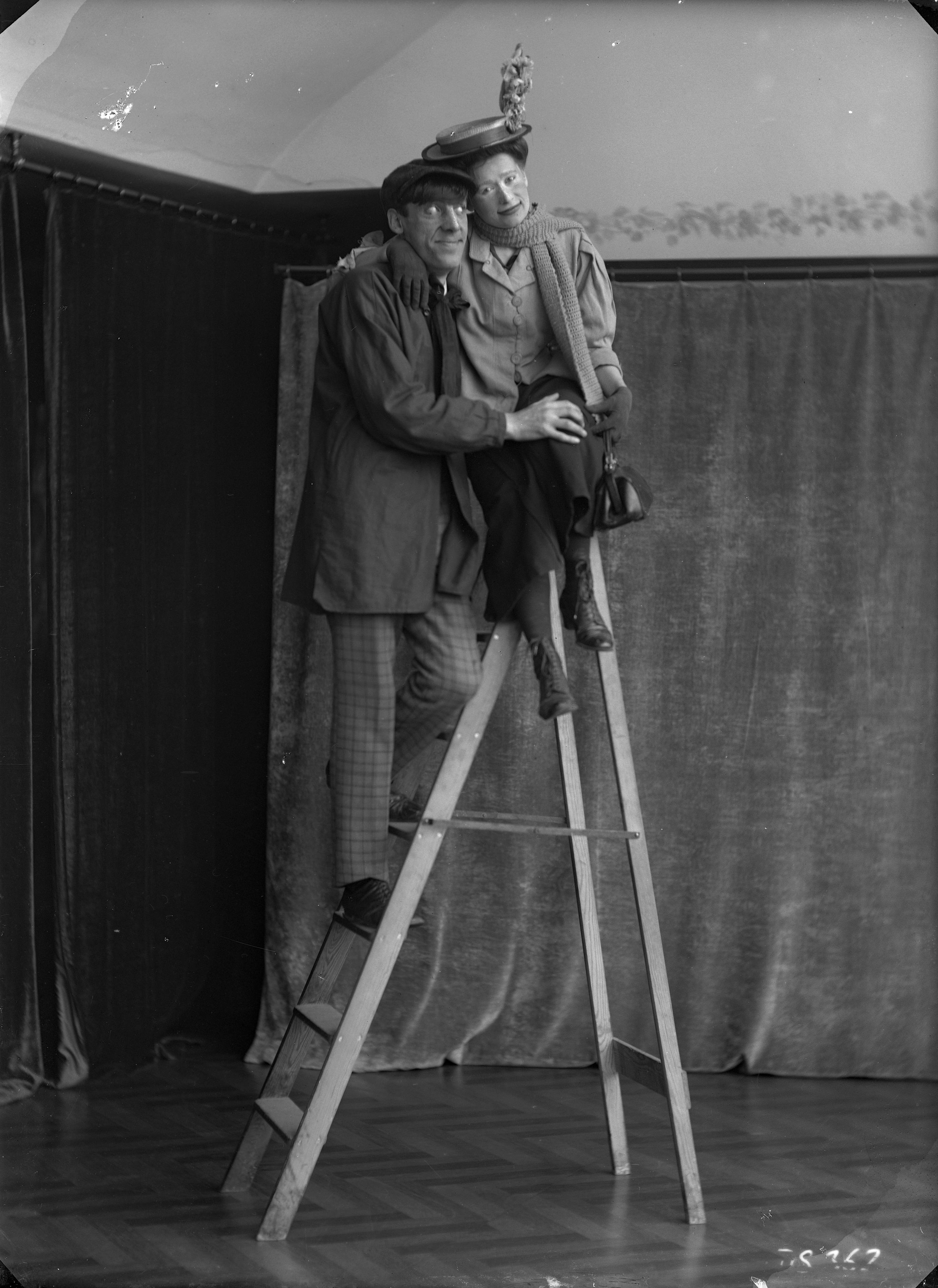 Beskrivning: Porträtt i helfigur av medlemmar ur Lianders teatersällskap på stege.