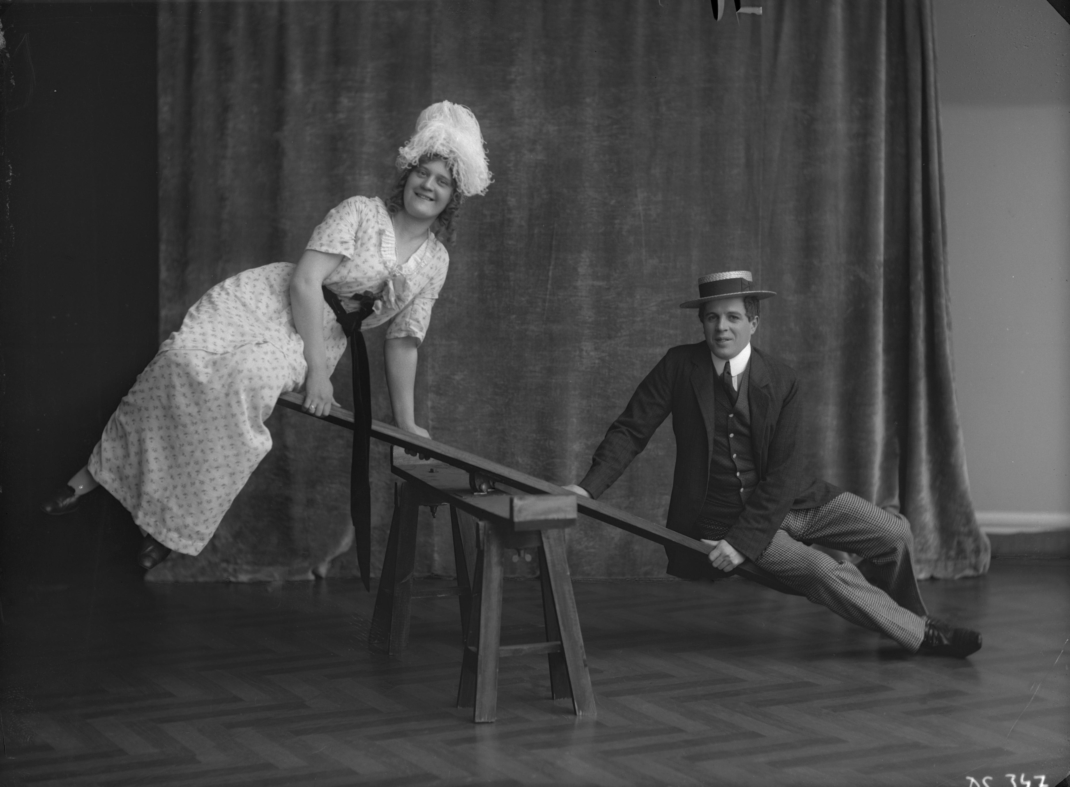 Porträtt i helfigur av medlemmar ur Lianders teatersällskap, sittande på gungbräda.