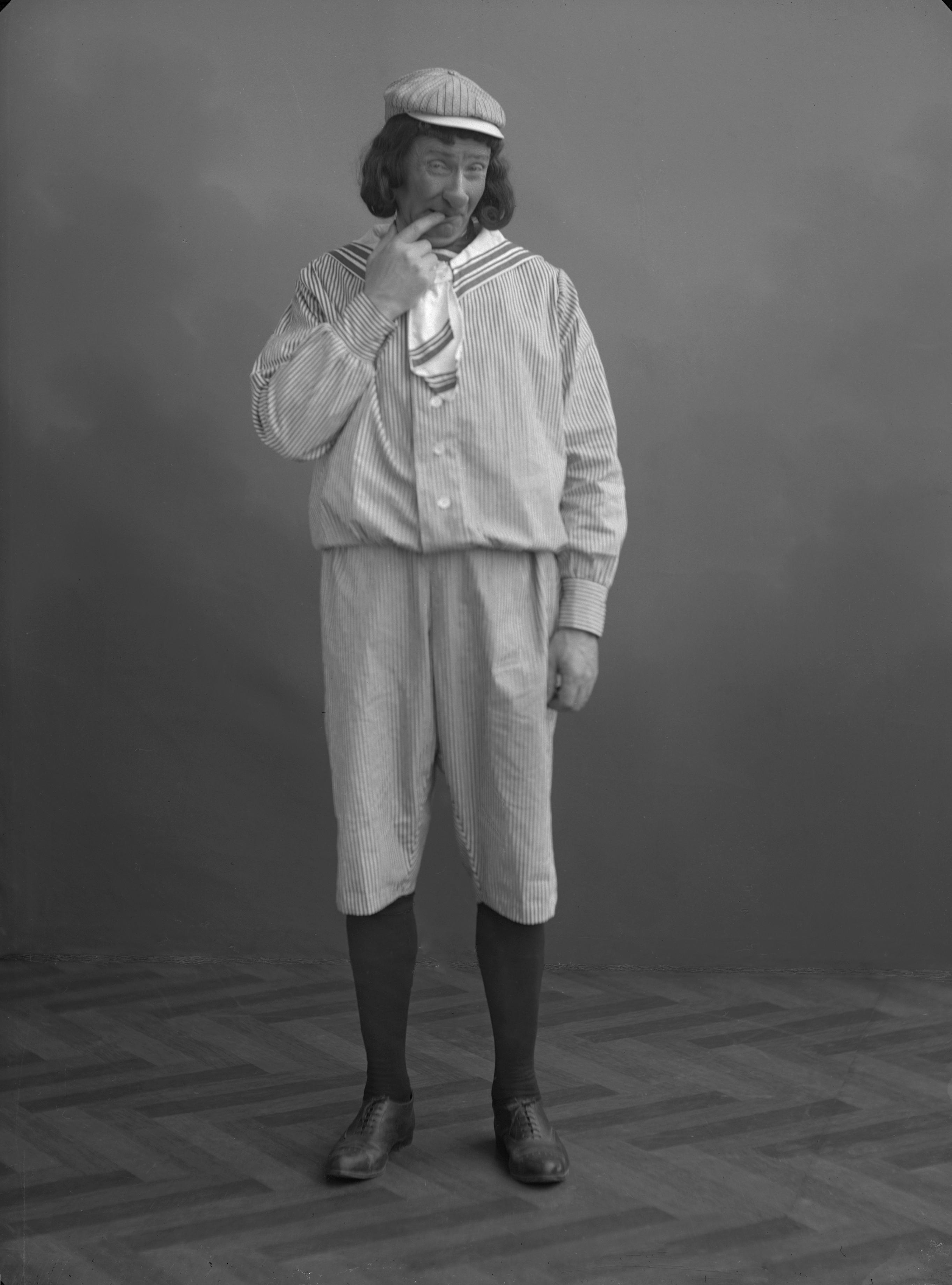 Porträtt i helfigur av medlem ur Lianders teatersällskap, "Liander".