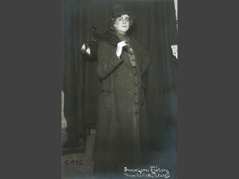 Beskrivning: Porträtt av skådespelerskan Anna Lisa Fröberg i teaterstycket "Samhällets pelare".