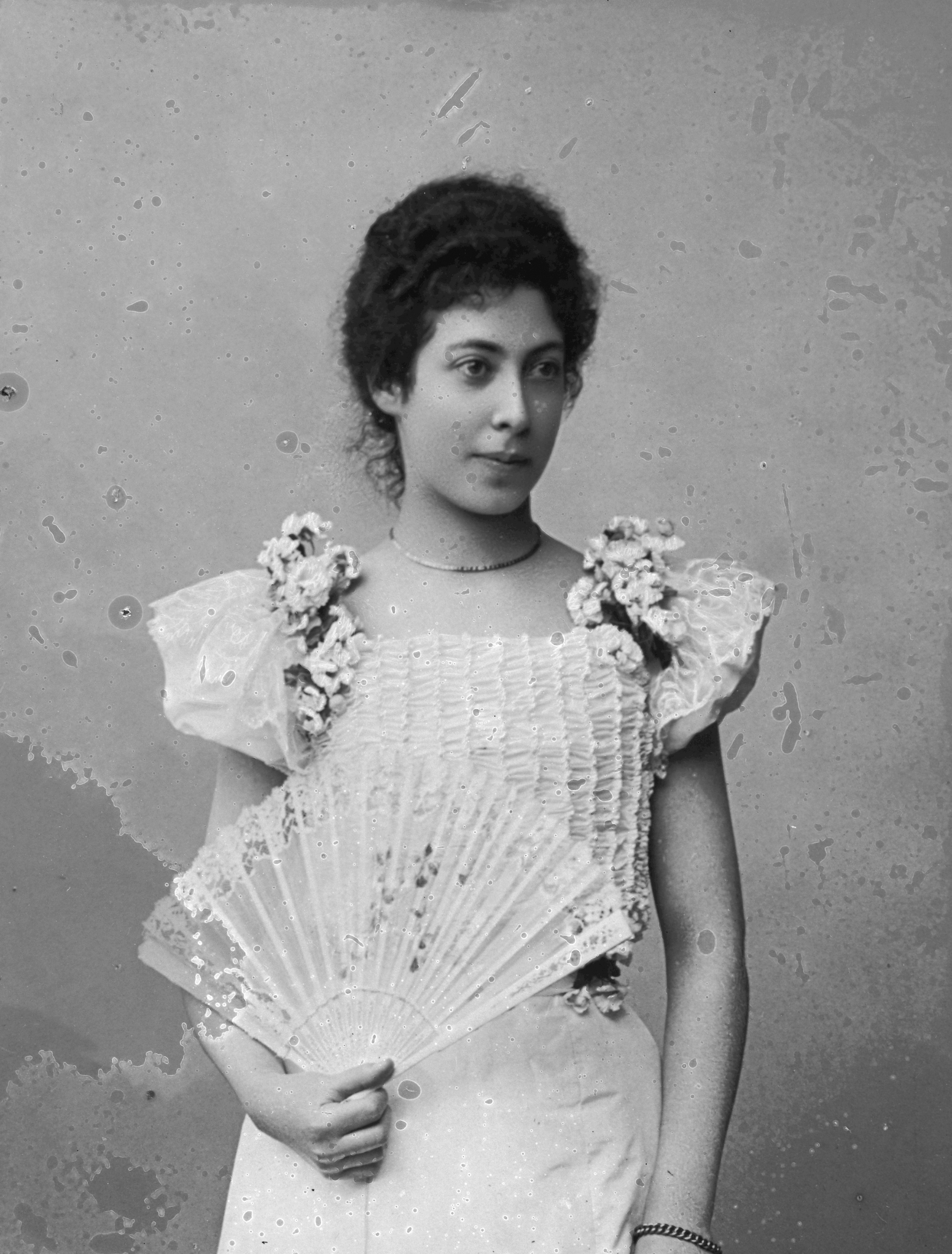Porträtt i halvfigur av fröken Zadig, hållande utfälld solfjäder.