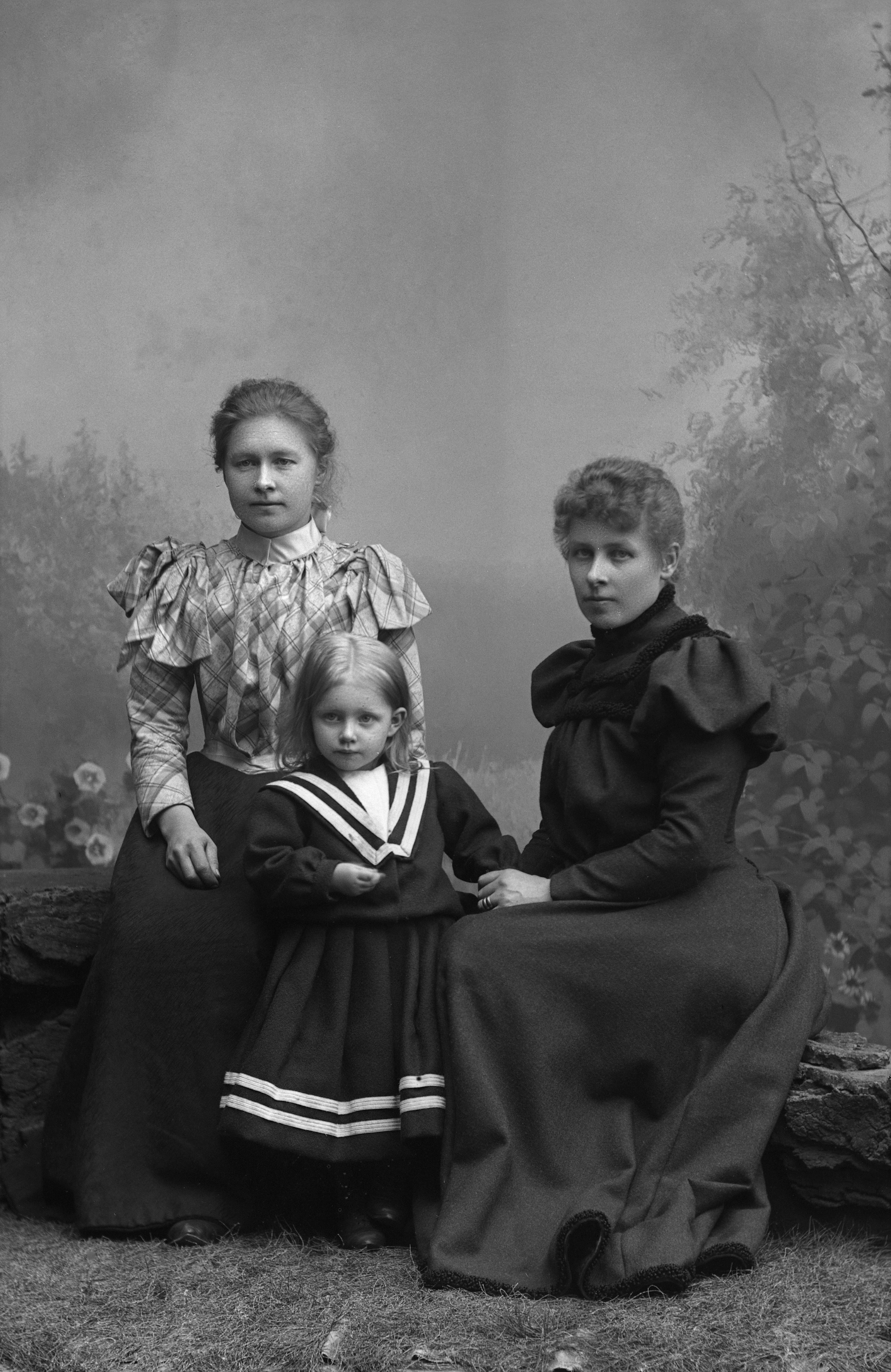 Porträtt i helfigur av Hilda Möller och fru Nilsson, restauranganställda, med dotter. Kvinnorna sittande på stenhäll. Fotograferade framför ateljéfond med skogs- och blomstermotiv.